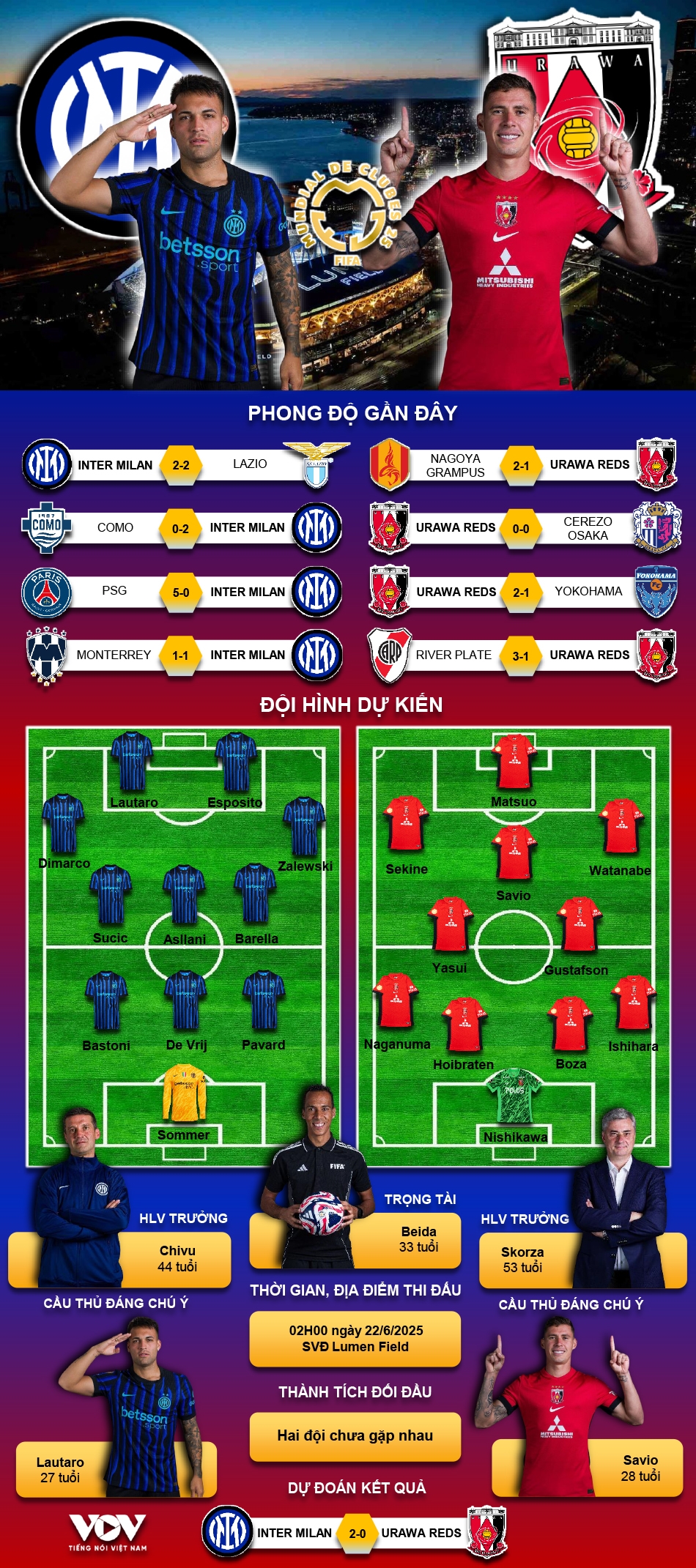 Dự đoán kết quả và đội hình ra sân trận Inter Milan vs Urawa Red Diamonds, thuộc khuôn khổ lượt 2 bảng E - FIFA Club World Cup 2025™ diễn ra vào lúc 02h00 ngày 22/6.