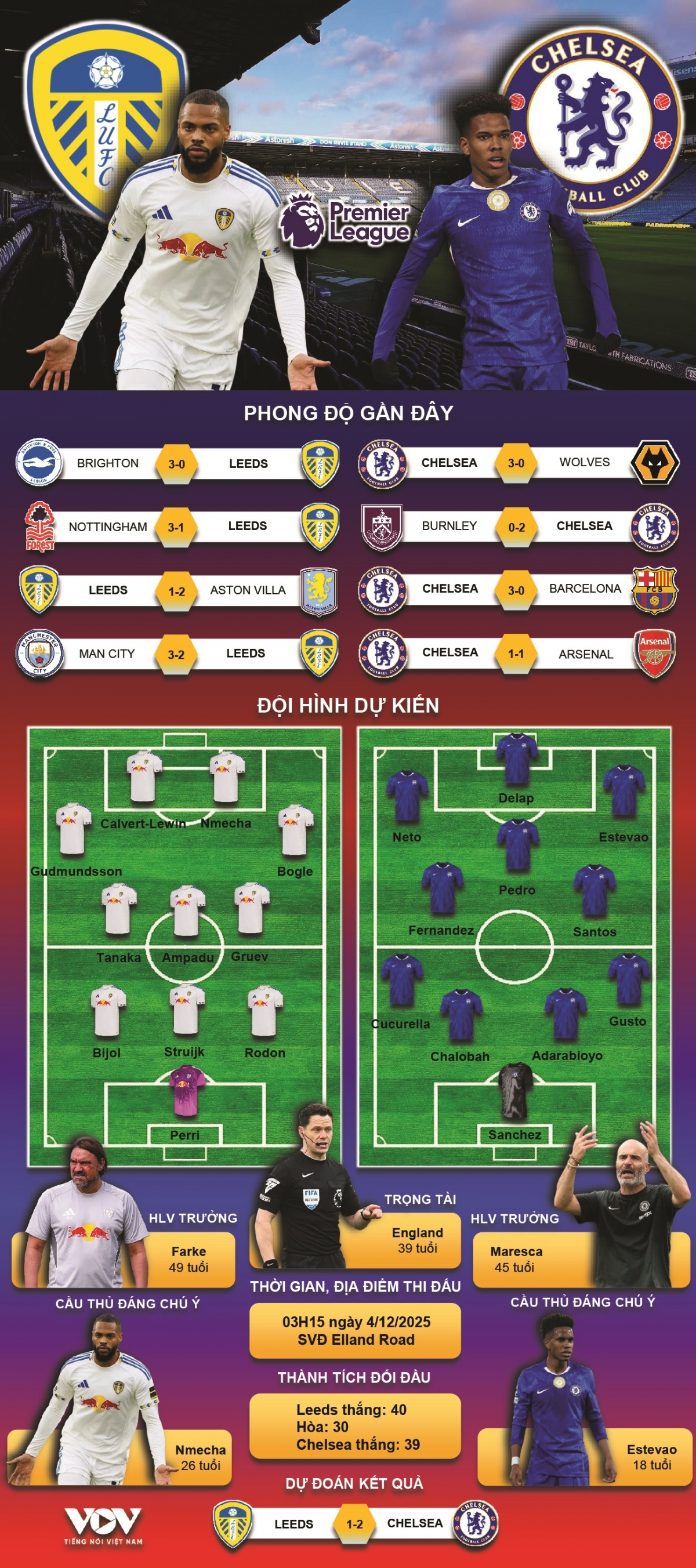 VOV.VN - Dự đoán kết quả và đội hình ra sân trận Leeds United vs Chelsea thuộc khuôn khổ vòng 14 Ngoại hạng Anh 2025/2026 diễn ra lúc 03h15 ngày 4/12.