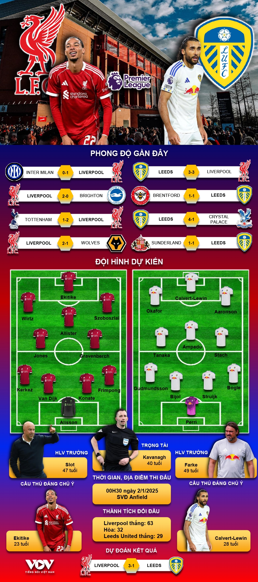 VOV.VN - Dự đoán kết quả và đội hình ra sân trận Liverpool vs Leeds United thuộc khuôn khổ vòng 19 Ngoại hạng Anh 2025/2026 diễn ra lúc 00h30 ngày 2/1.