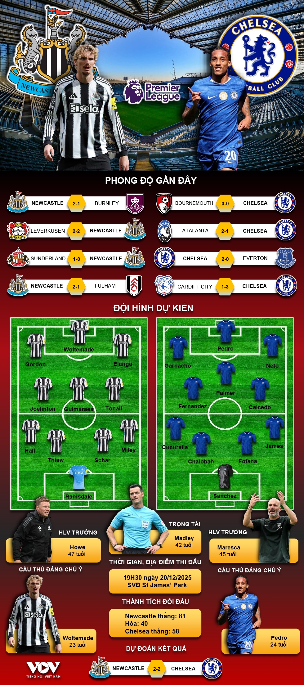 VOV.VN - Dự đoán kết quả và đội hình ra sân trận Newcastle vs Chelsea thuộc khuôn khổ vòng 17 Ngoại hạng Anh 2025/2026 diễn ra lúc 19h30 ngày 20/12.