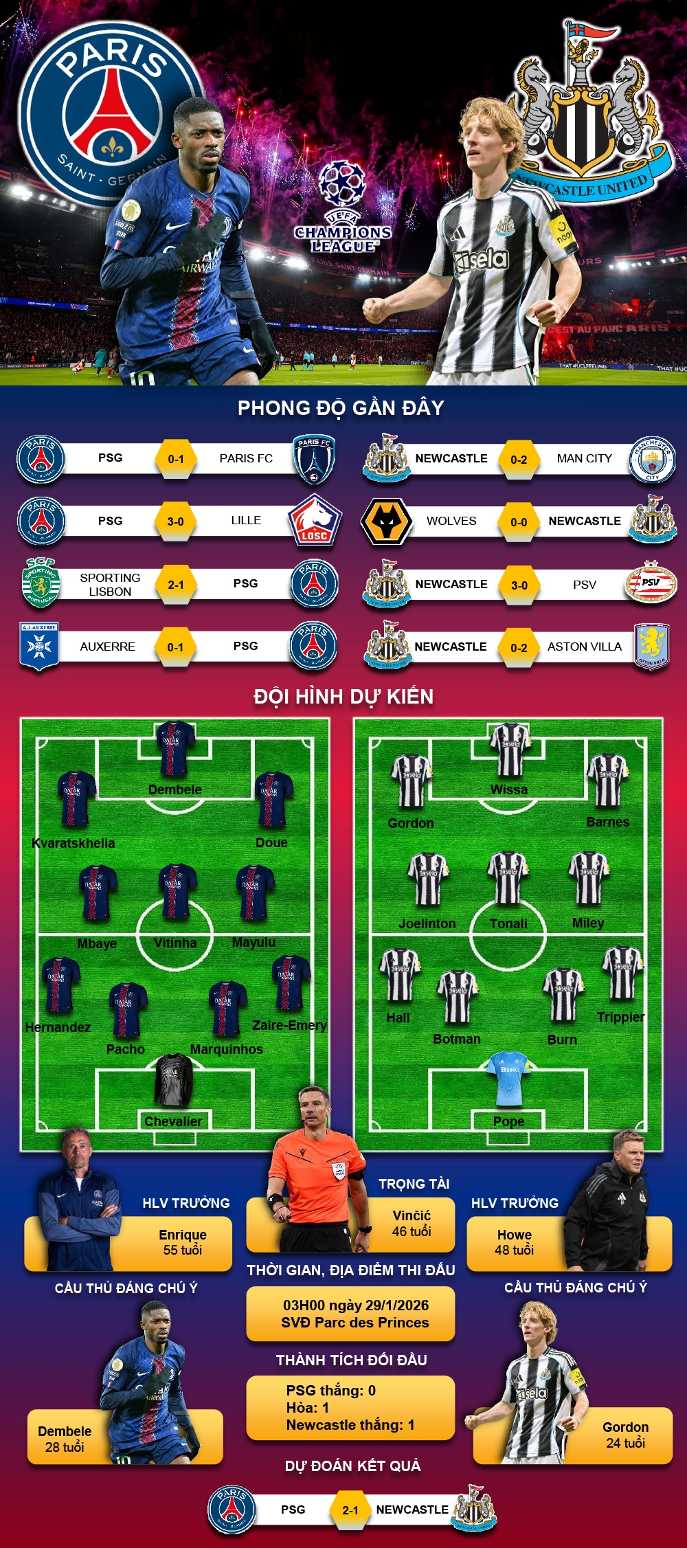 Dự đoán kết quả và đội hình ra sân trận PSG vs Newcastle United thuộc khuôn khổ lượt trận 8 vòng bảng Cúp C1 châu Âu 2025/2026 diễn ra vào lúc 03h00 ngày 29/1.