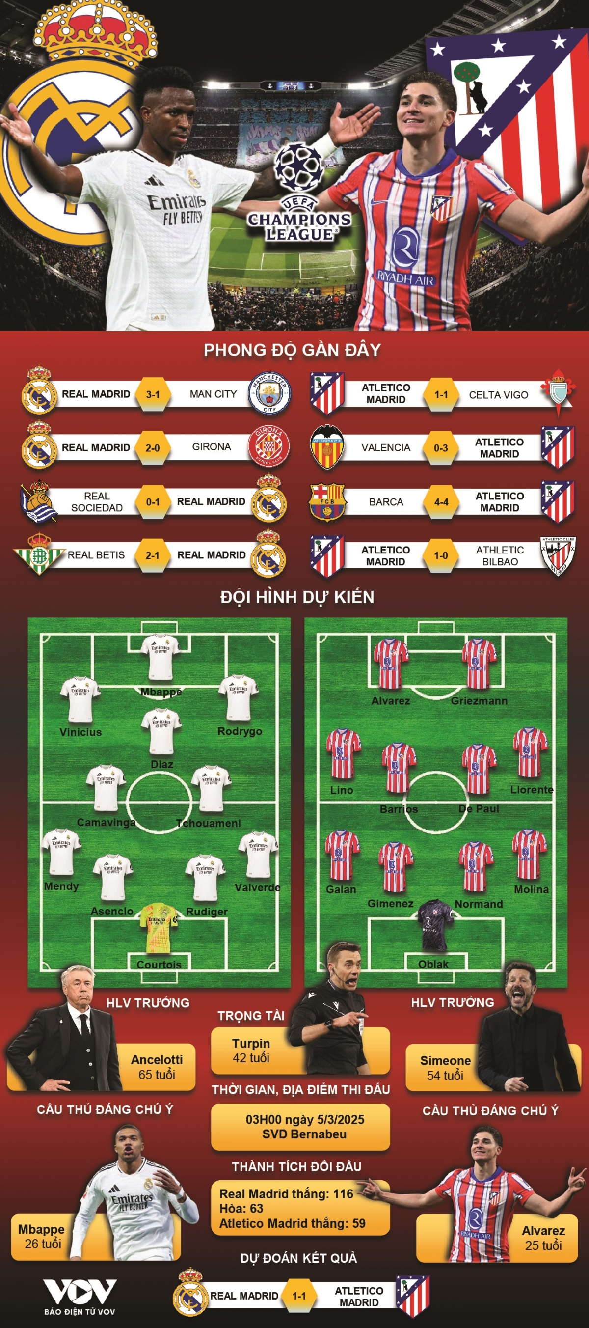 VOV.VN - Dự đoán kết quả và đội hình ra sân trận Real Madrid vs Atletico Madrid, thuộc khuôn khổ lượt đi vòng 1/8 Cúp C1 châu Âu 2024/2025 diễn ra lúc 03h00 ngày 5/3.