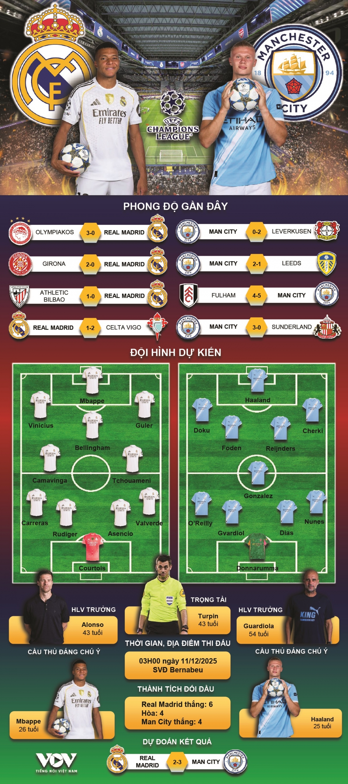 VOV.VN - Dự đoán kết quả và đội hình ra sân trận Real Madrid vs Man City thuộc khuôn khổ vòng bảng Cúp C1 châu Âu 2025/2026 diễn ra lúc 03h00 ngày 11/12.