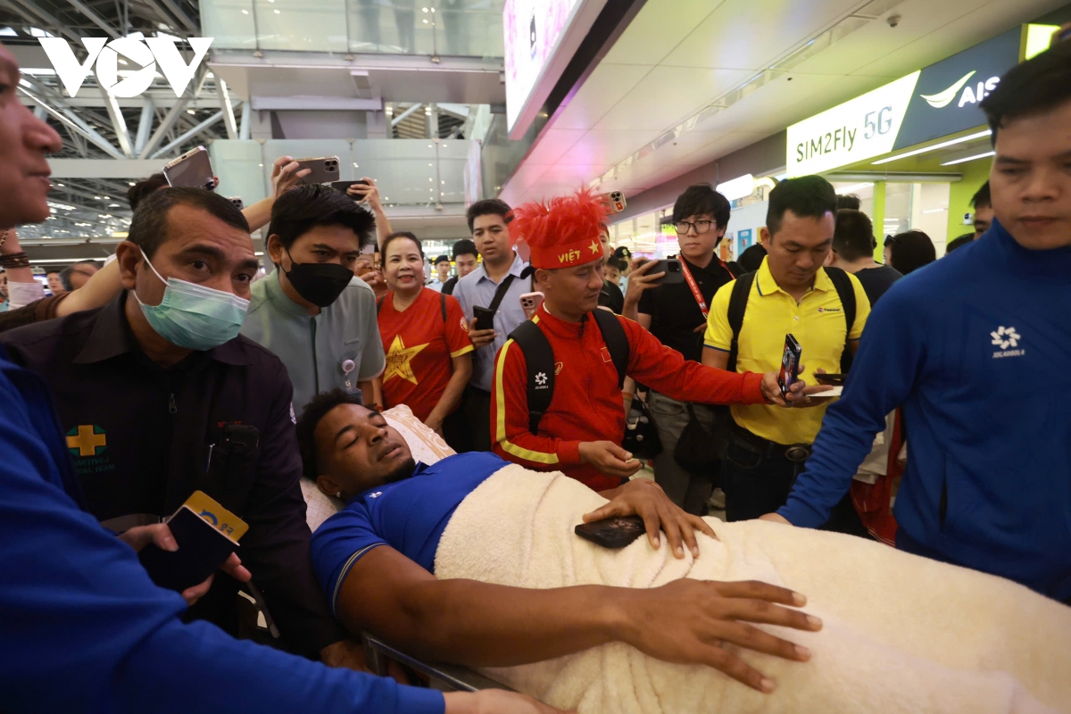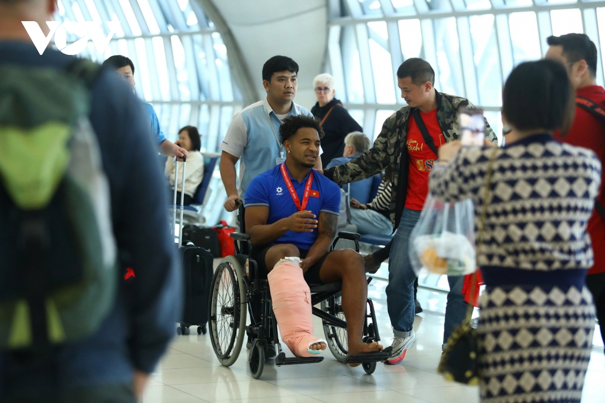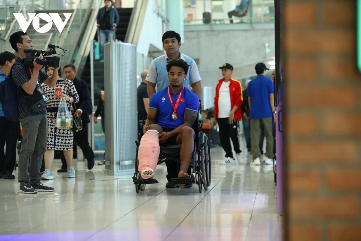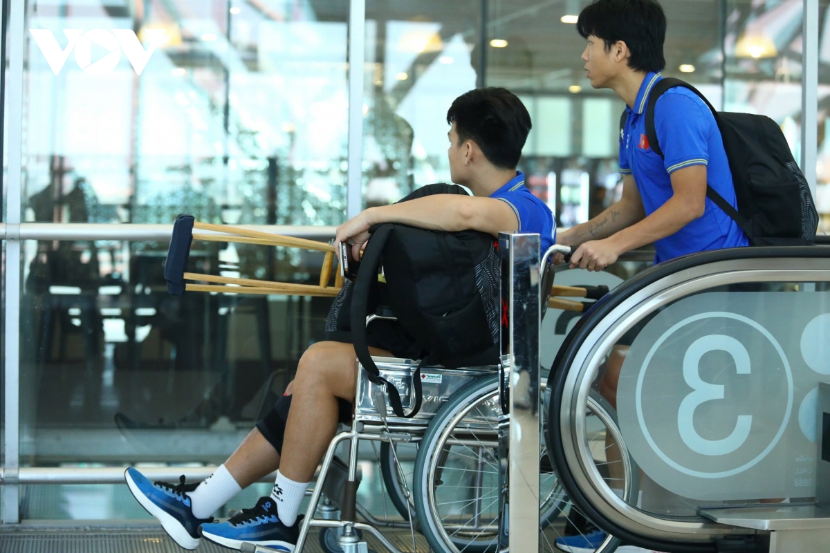 Tiền đạo Xuân Son – người dính chấn thương nặng phải nằm trên giường cứu thương để lên máy bay. Trong khi đó, hậu vệ Hồ Tấn Tài cũng phải ngồi xe lăn về nước.