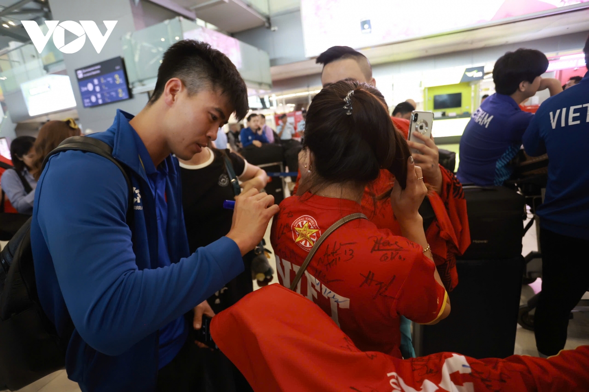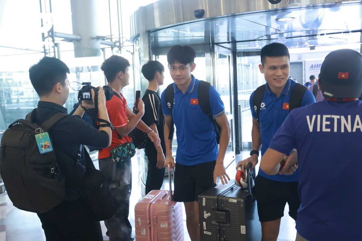 Tại sân bay, thầy trò HLV Kim Sang Sik nhận được sự chào đón nồng nhiệt từ phía người hâm mộ bóng đá Việt Nam.
