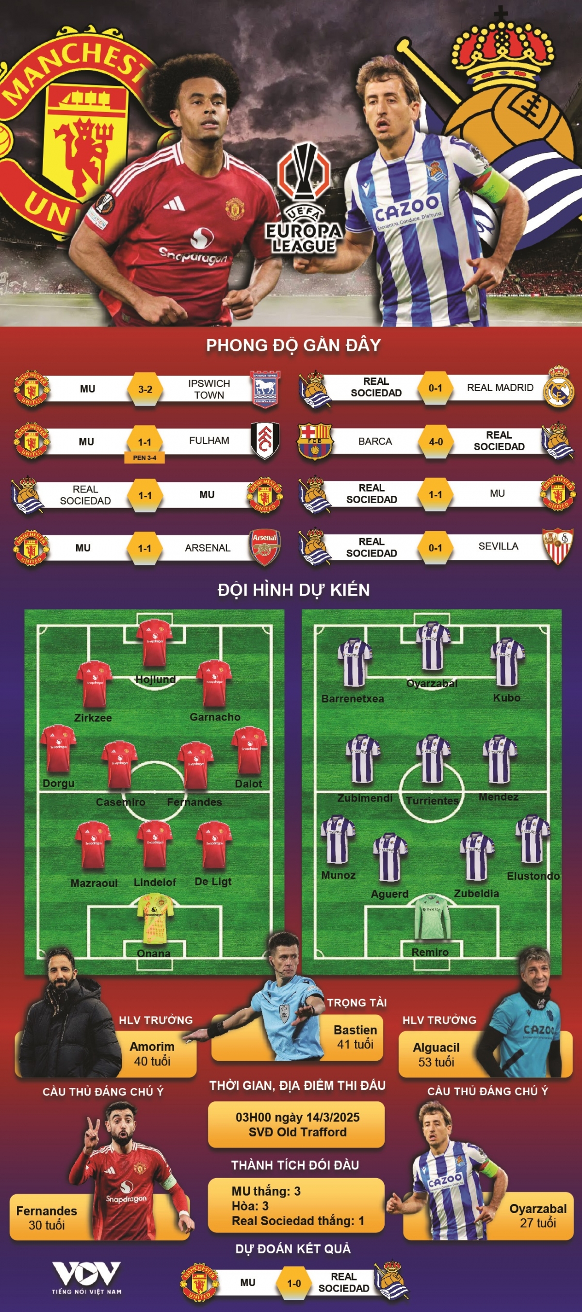 VOV.VN - Dự đoán kết quả và đội hình ra sân trận MU vs Real Sociedad, thuộc khuôn khổ lượt về vòng 1/8 Cúp C2 châu Âu 2024/2025 diễn ra lúc 03h0 ngày 14/3.
