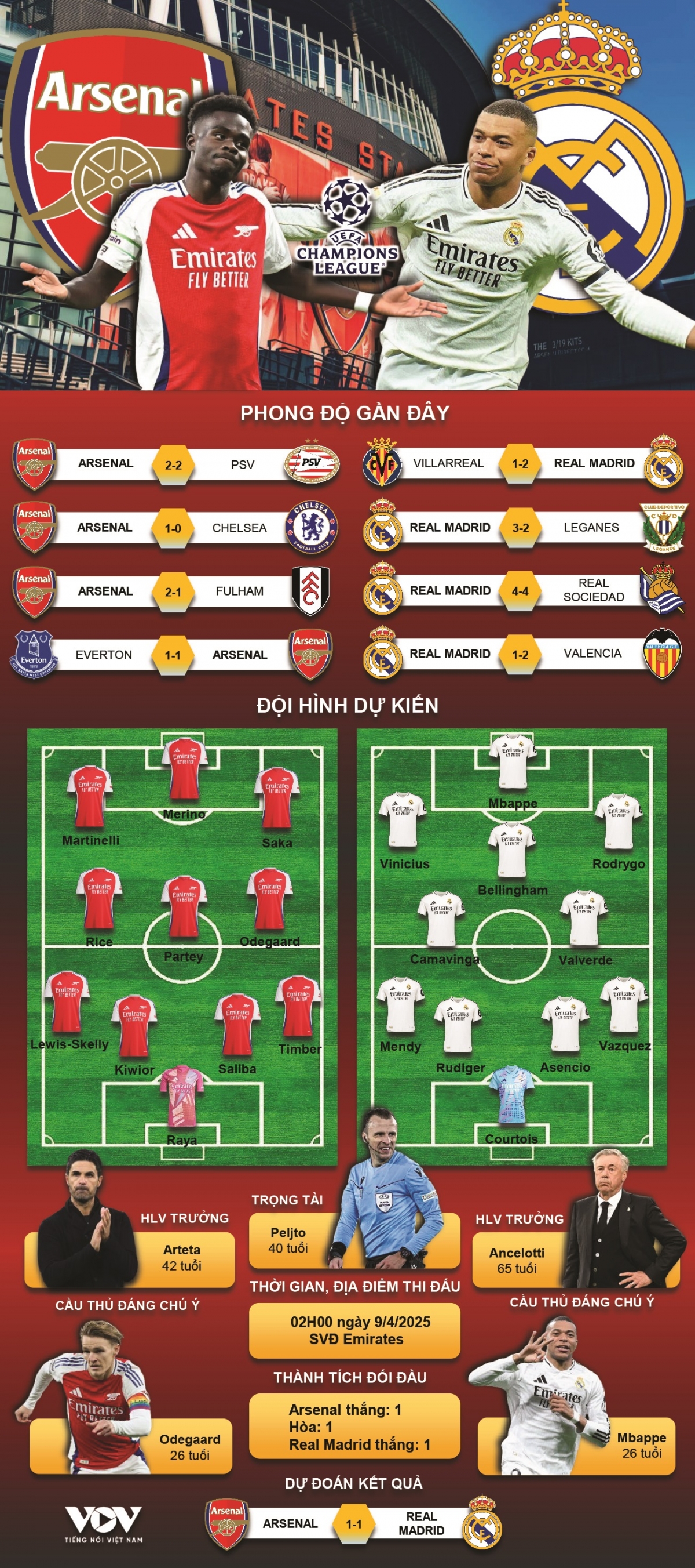 VOV.VN - Dự đoán kết quả và đội hình ra sân trận Arsenal vs Real Madrid, thuộc khuôn khổ trận tứ kết lượt đi Cúp C1 châu Âu 2024/2025 diễn ra lúc 02h00 ngày 9/4.