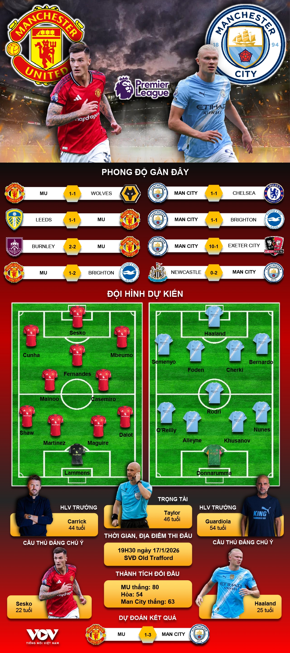 Ở 197 lần đối đầu đó, MU chiếm ưu thế với 80 chiến thắng, 54 trận hòa và nhận 63 thất bại trước Man City. Dẫu vậy, đoàn quân HLV Pep Guardiola bước vào derby lần này với tâm thế hoàn toàn khác.