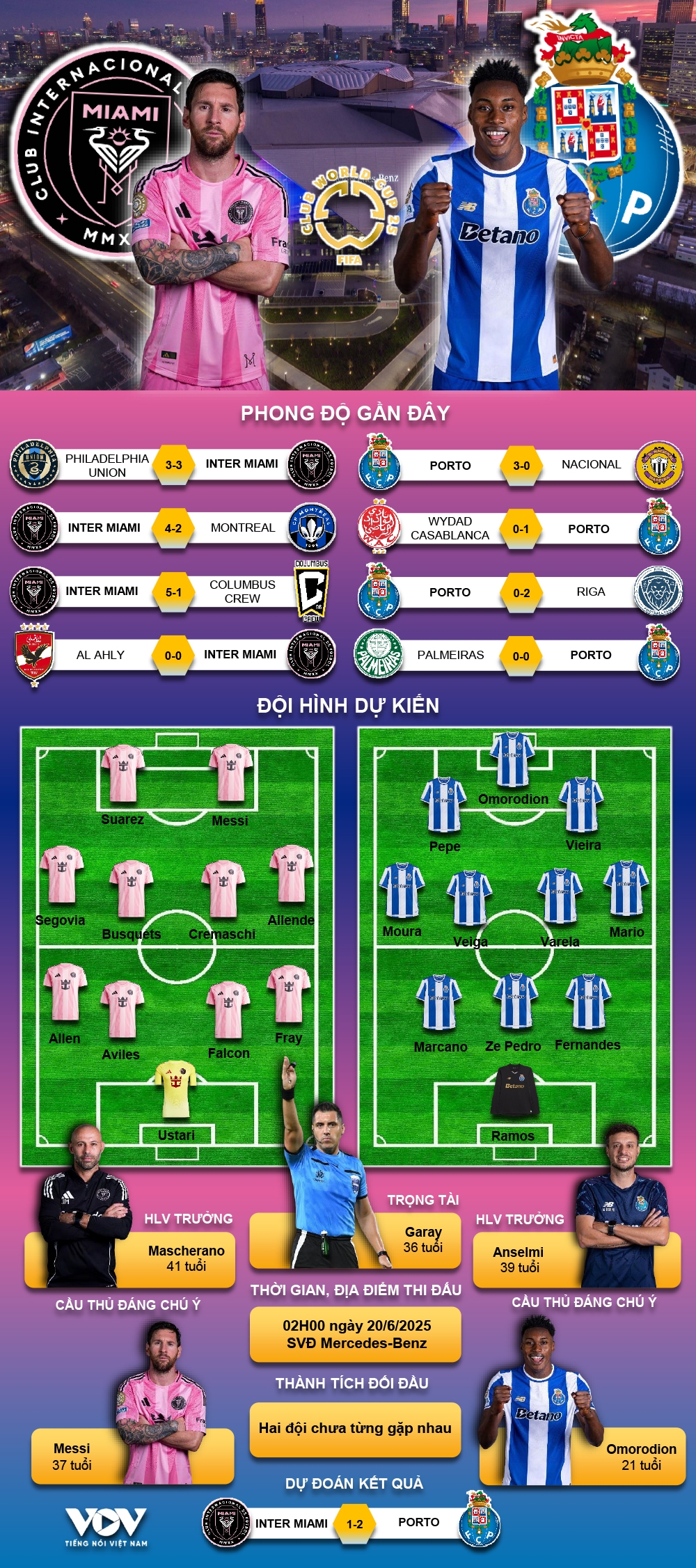 Xin chào các độc giả của VOV.VN, hôm nay chúng ta sẽ đến với buổi tường thuật trực tiếp trận đấu giữa 2 đội Inter Miami vs Porto, lượt trận thứ 2 bảng A - Club World Cup 2025.