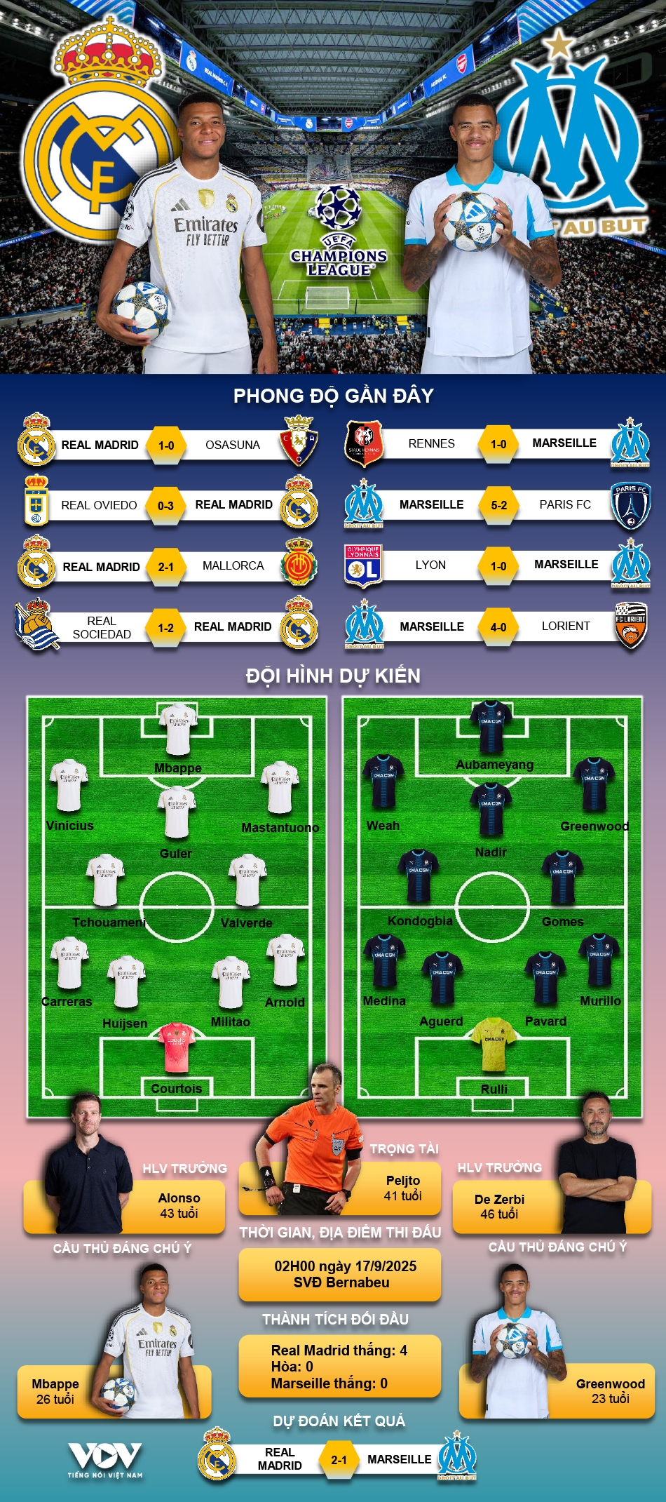 VOV.VN - Dự đoán kết quả và đội hình ra sân trận Real Madrid vs Marseille, thuộc khuôn khổ vòng bảng Cúp C1 châu Âu 2025/2026 diễn ra lúc 02h00 ngày 17/9.