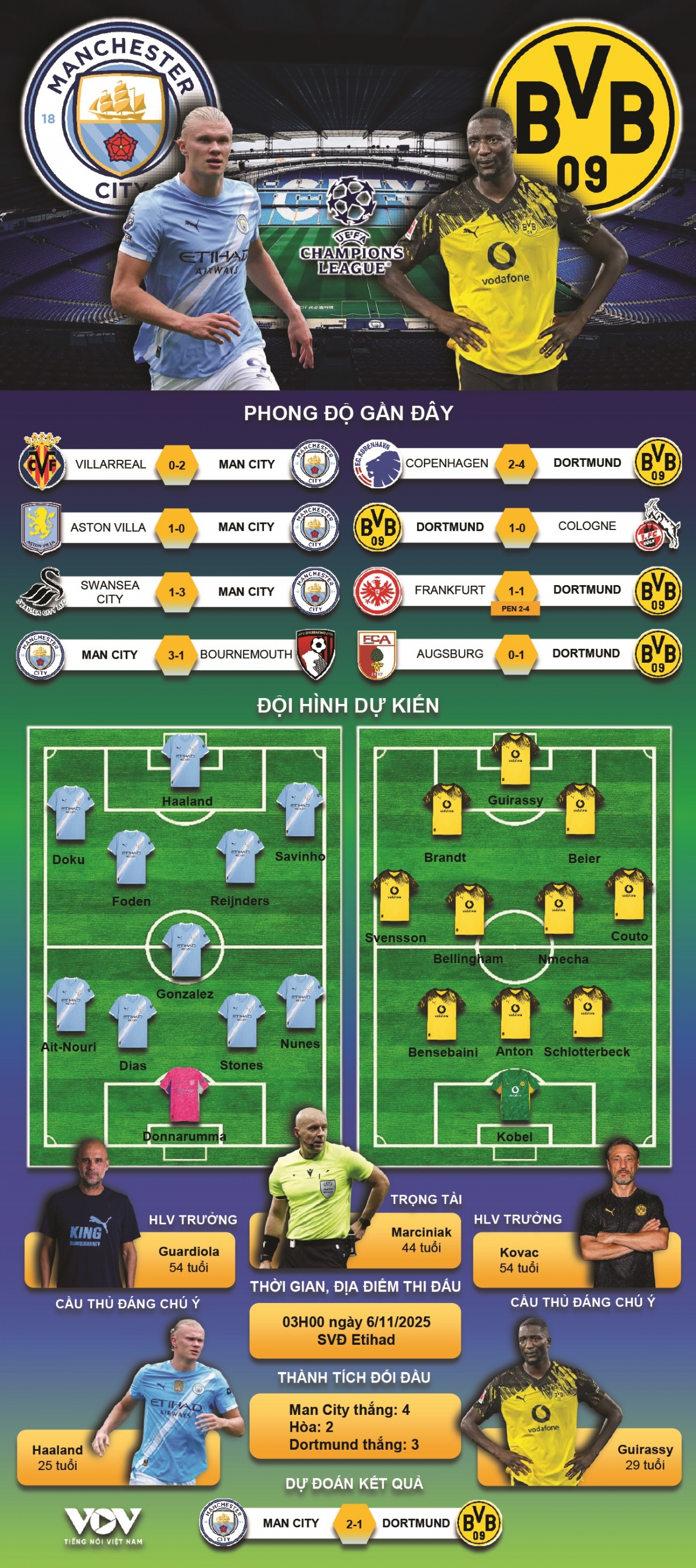 Trận đấu giữa Man City vs Dortmund sẽ diễn ra vào 3h00 ngày 6/11.