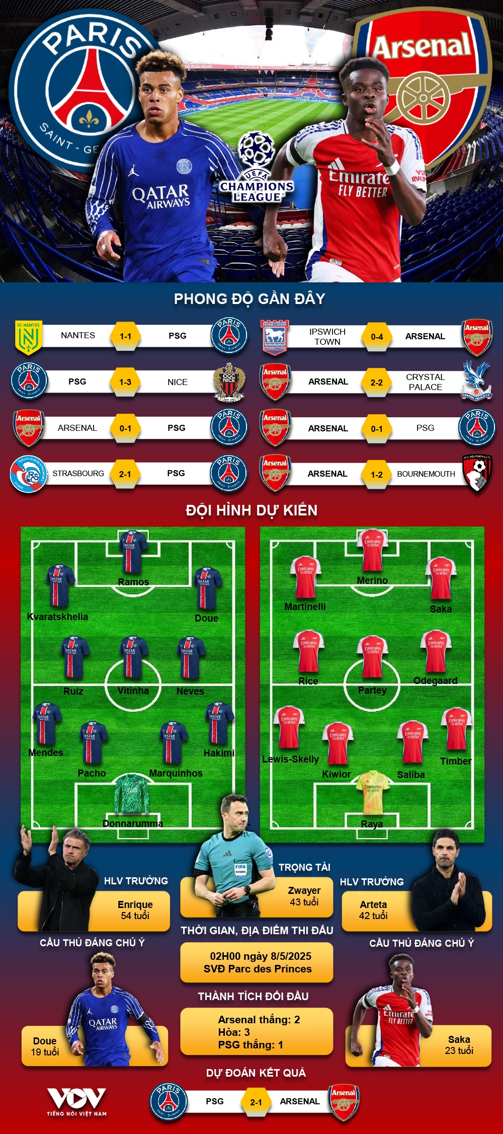 VOV.VN - Dự đoán kết quả và đội hình ra sân trận Arsenal vs PSG, thuộc khuôn khổ trận bán kết lượt đi Cúp C1 châu Âu 2024/2025 diễn ra lúc 02h00 ngày 30/4.