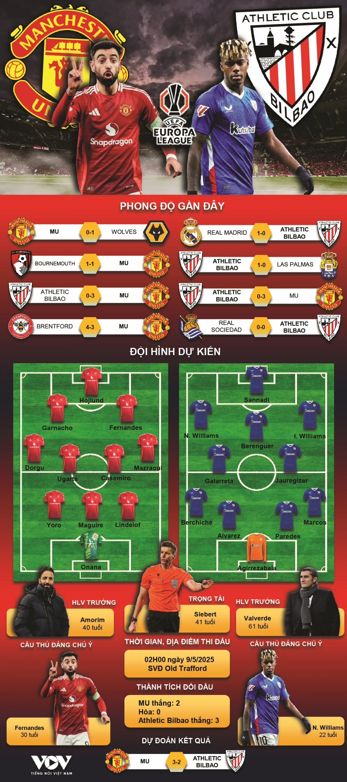 VOV.VN - Dự đoán kết quả và đội hình ra sân trận MU vs Athletic Bilbao, thuộc khuôn khổ trận bán kết lượt về Cúp C2 châu Âu 2024/2025 diễn ra lúc 02h00 ngày 9/5.