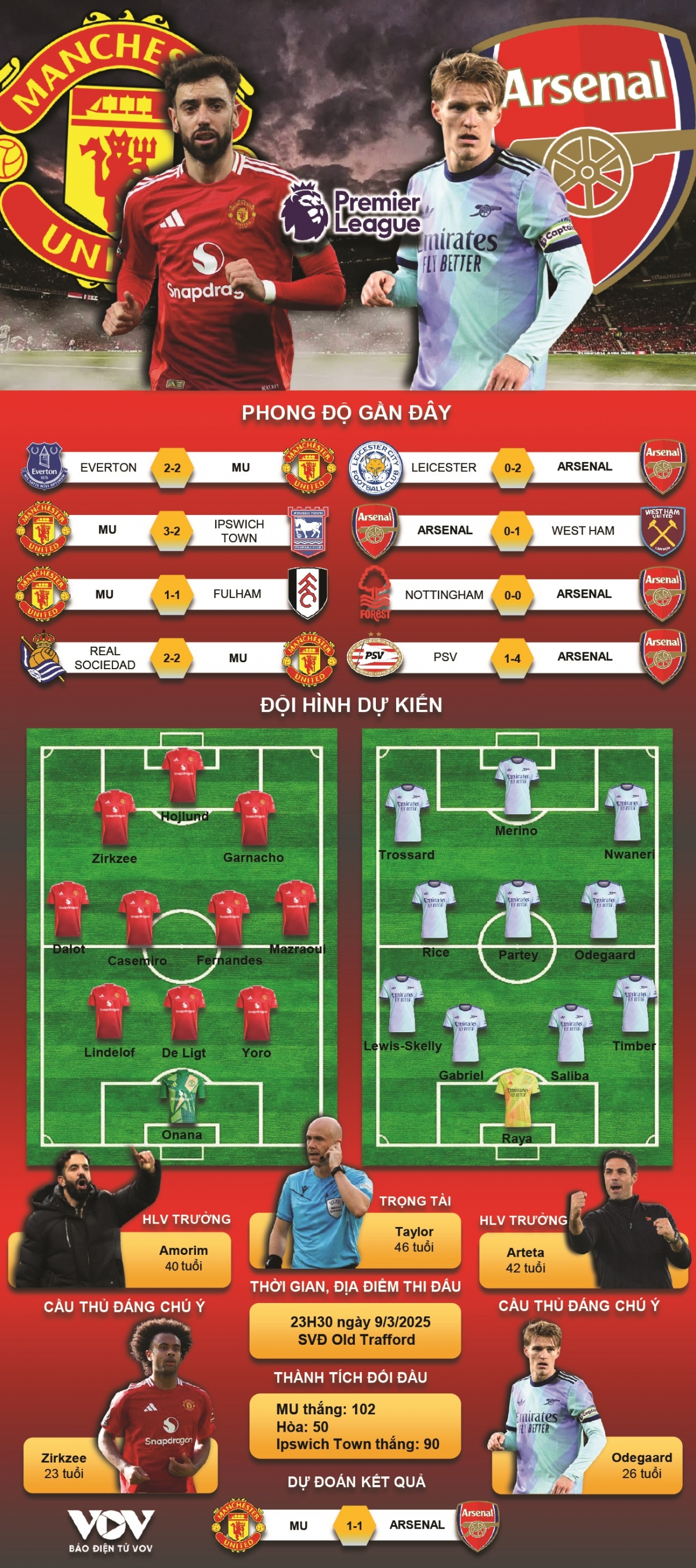 VOV.VN - Dự đoán kết quả và đội hình ra sân trận MU vs Arsenal, thuộc khuôn khổ vòng 28 Ngoại hạng Anh 2024/2025 diễn ra lúc 23h30 ngày 9/3.