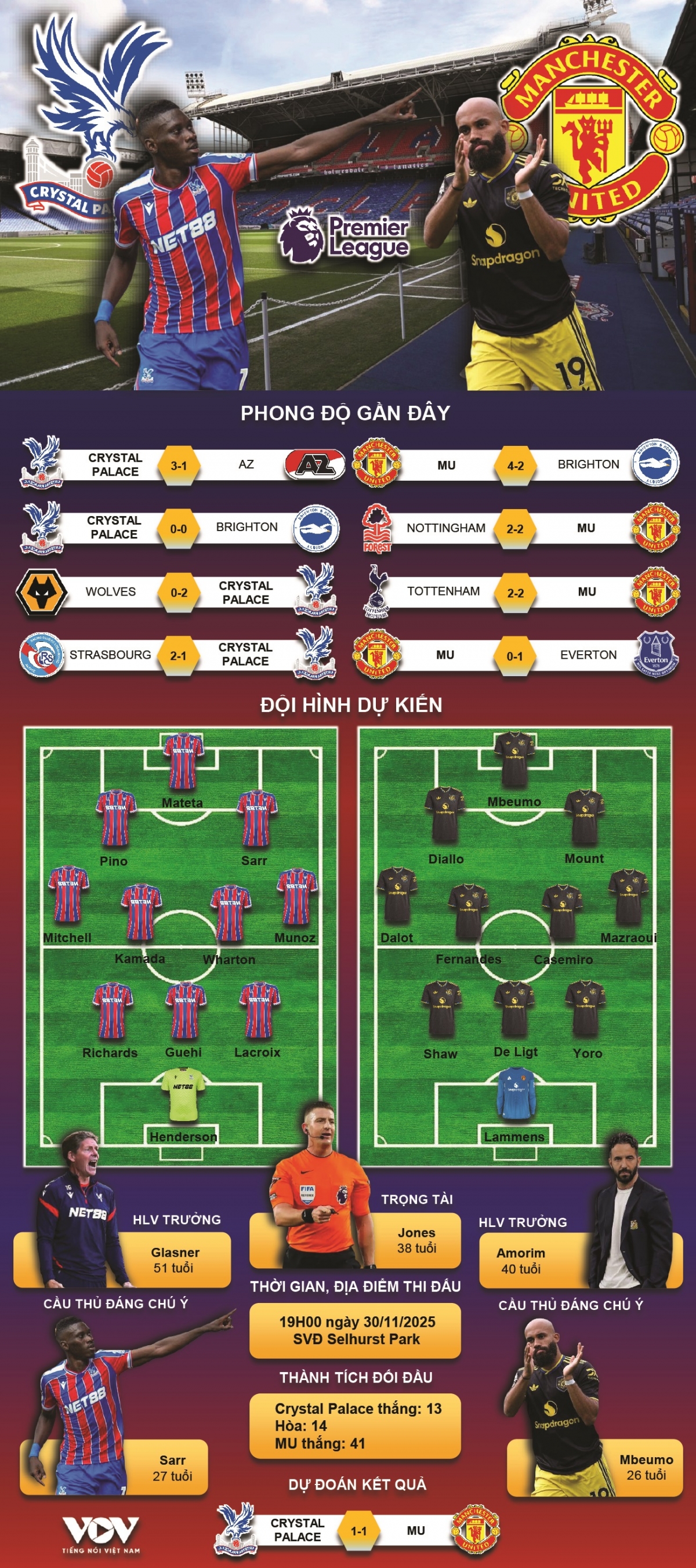 Xin chào các độc giả của VOV.VN, hôm nay chúng ta sẽ đến với buổi tường thuật trực tiếp trận đấu bóng đá Crystal Palace vs MU tại vòng 13 Ngoại hạng Anh.