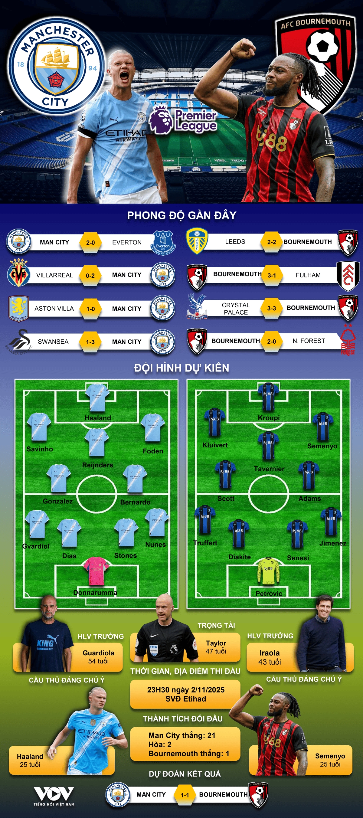 VOV.VN - Dự đoán kết quả và đội hình ra sân trận Man City vs Bournemouth, vòng 10 Ngoại hạng Anh 2025/2026 diễn ra lúc 23h30 ngày 2/11/2025.