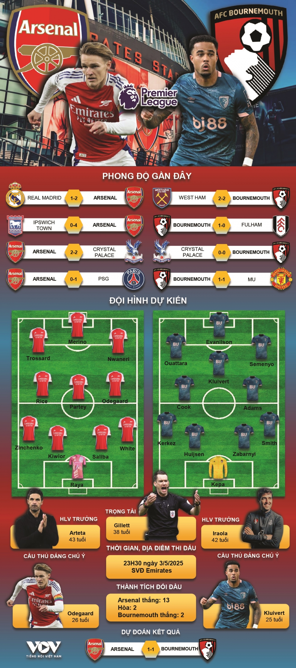 VOV.VN - Dự đoán kết quả và đội hình ra sân trận Arsenal vs Bournemouth, thuộc khuôn khổ vòng 35 Ngoại hạng Anh 2024/2025 diễn ra lúc 23h30 ngày 3/5.