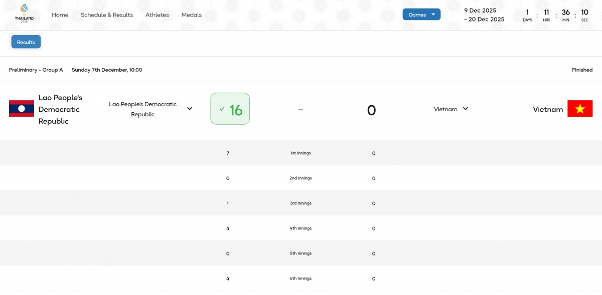 Kết quả SEA Games 33 hôm nay 7/12, đội tuyển bóng chày nam của Việt Nam gây thất vọng lớn khi thua 0-16 trước đội tuyển bóng chày nam của Lào ở lượt trận thứ ba trong giai đoạn thi đấu vòng tròn.