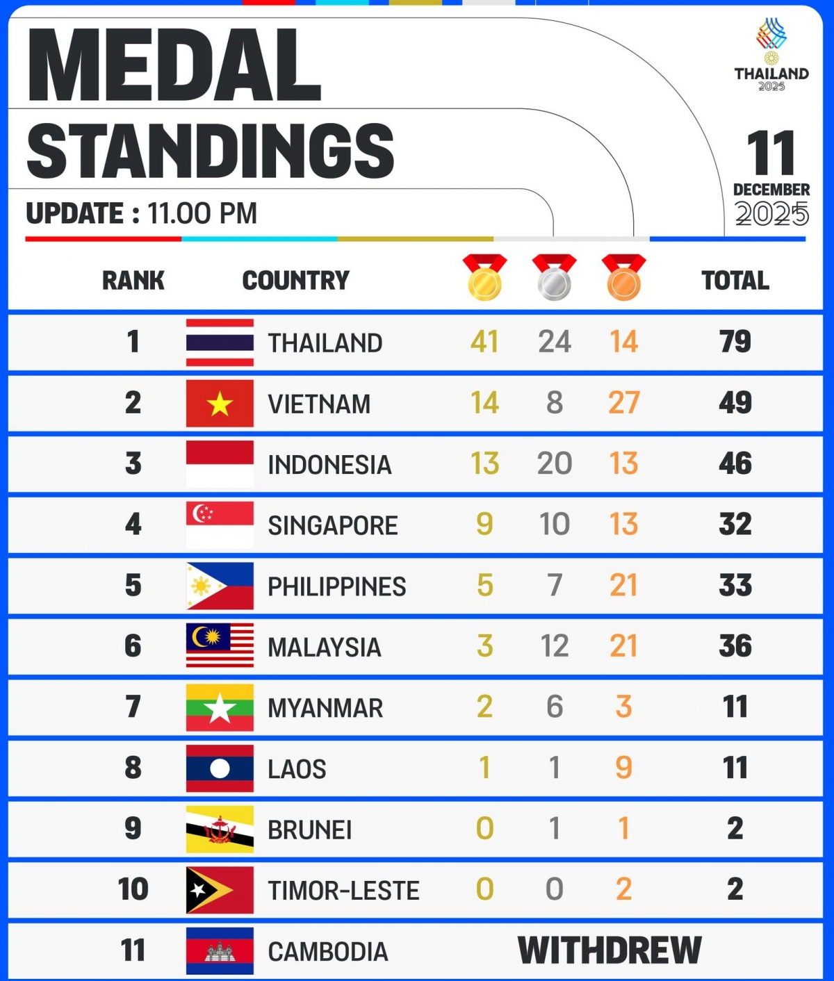 Cập nhật bảng tổng sắp huy chương SEA Games 33 mới nhất tính đến sáng 11/12, Đoàn Thể thao Thái Lan dẫn đầu với 19 HCV, 13 HCB và 10 HCĐ. Indonesia đứng thứ 2 với 5 HCV, 9 HCB và 7 HCĐ. Đoàn Thể thao Việt Nam tạm đứng thứ 4 với 4 HCV, 4 HCB và 16 HCĐ.