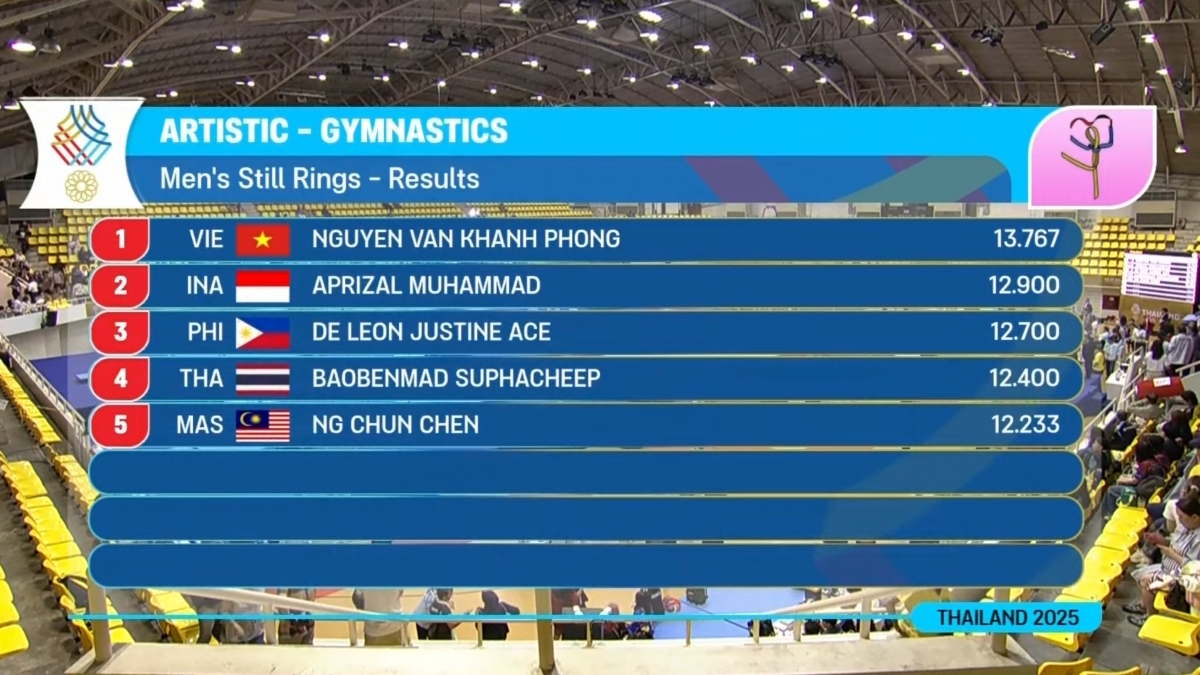 Thể dục dụng cụ tiếp tục là điểm sáng khi Đặng Ngọc Xuân Thiện (ngựa vòng) và Nguyễn Văn Khánh Phong (vòng treo) lần lượt đăng quang với điểm số vượt trội.