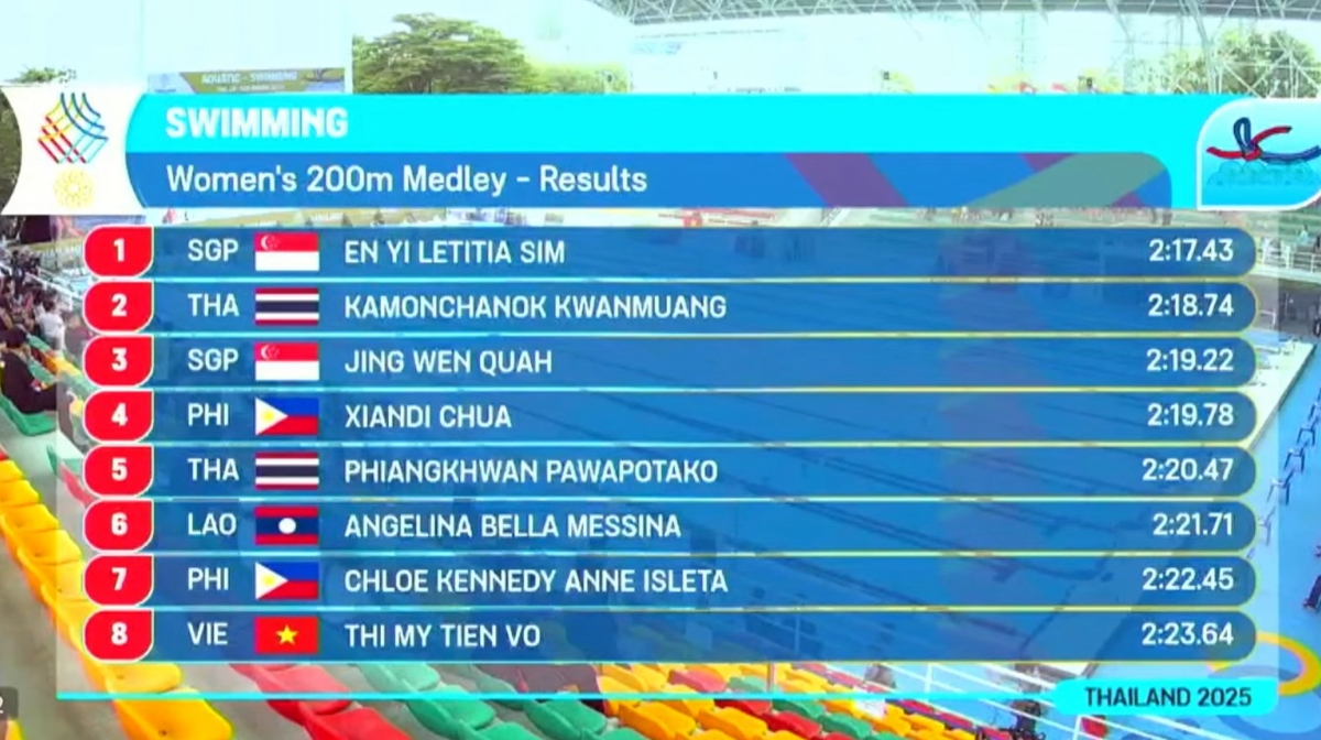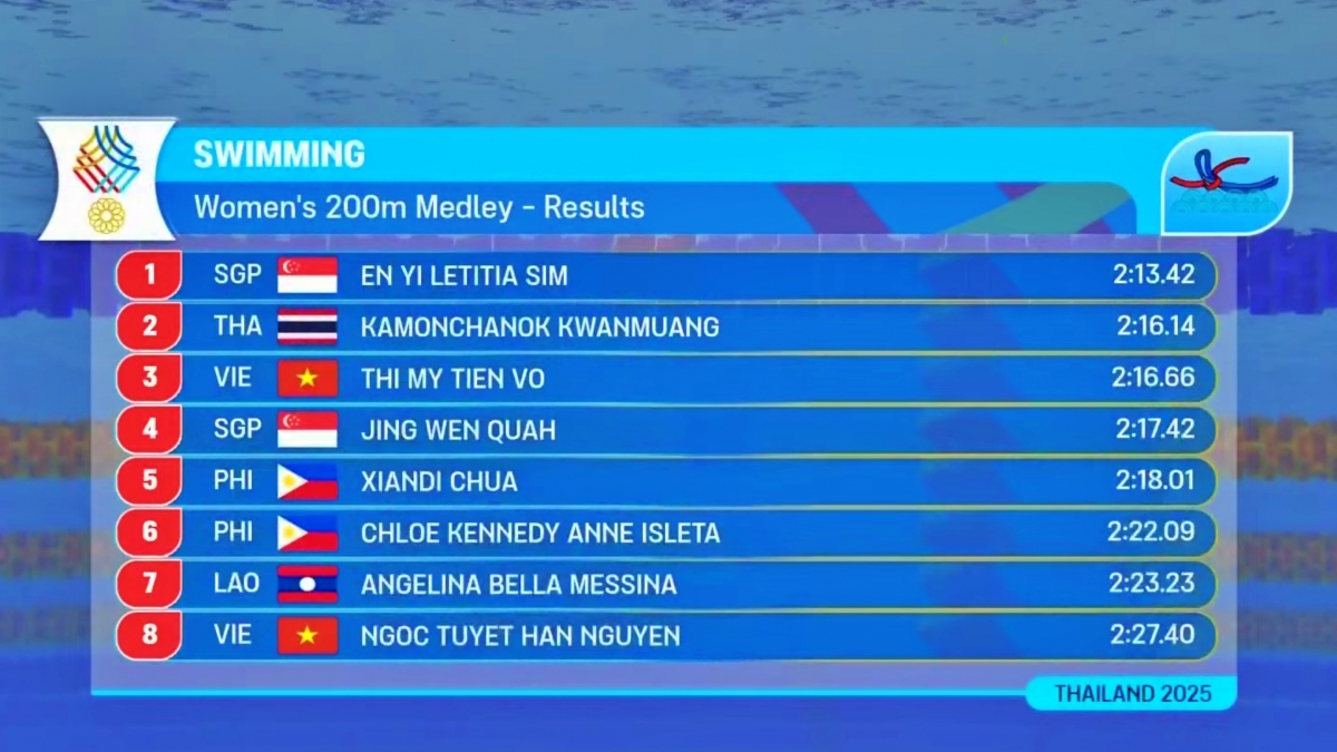 MÔN BƠI: Ở nội dung 200m hỗn hợp cá nhân nữ, Võ Thị Mỹ Tiên đạt thành tích 2 phút 16 giây 66, đứng thứ ba, qua đó giành tấm HCĐ. Về nhất ở nội dung này là vận động viên của Singapore, HCB thuộc về chủ nhà Thái Lan.