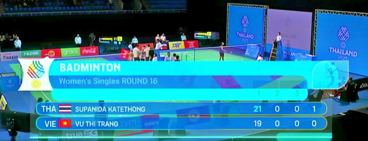 MÔN CẦU LÔNG: Vũ Thị Trang thua vận động viên Supanida Katethong của Thái Lan 7-21 ở set 2 qua đó thất bại chung cuộc 0-2.