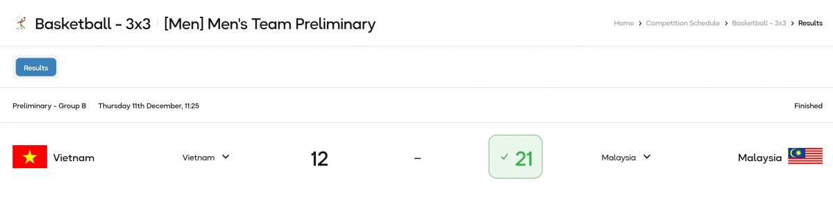BÓNG RỔ: Đội bóng rổ 3x3 nam thua Malaysia 12-21, nên không thể vượt qua vòng bảng.