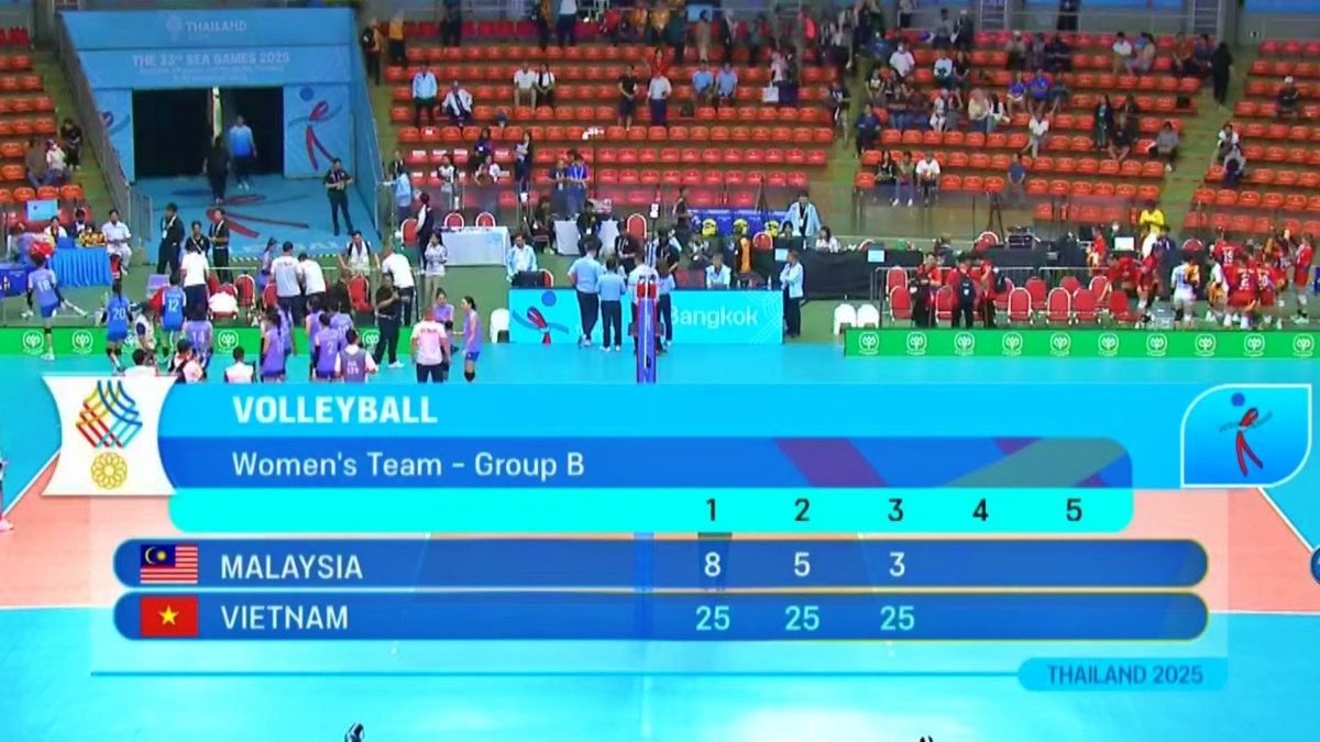 MÔN BÓNG CHUYỀN: Đội tuyển bóng chuyền nữ Việt Nam thắng áp đảo 3-0 trước đội tuyển bóng chuyền nữ Malaysia với điểm số các set là 25-8, 25-5 và 25-3. Đây là chiến thắng thứ 2 liên tiếp của thầy trò HLV Tuấn Kiệt ở SEA Games 33.