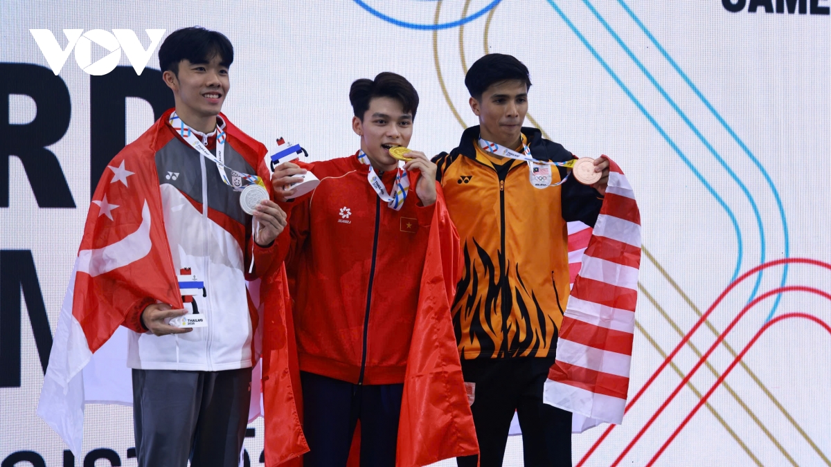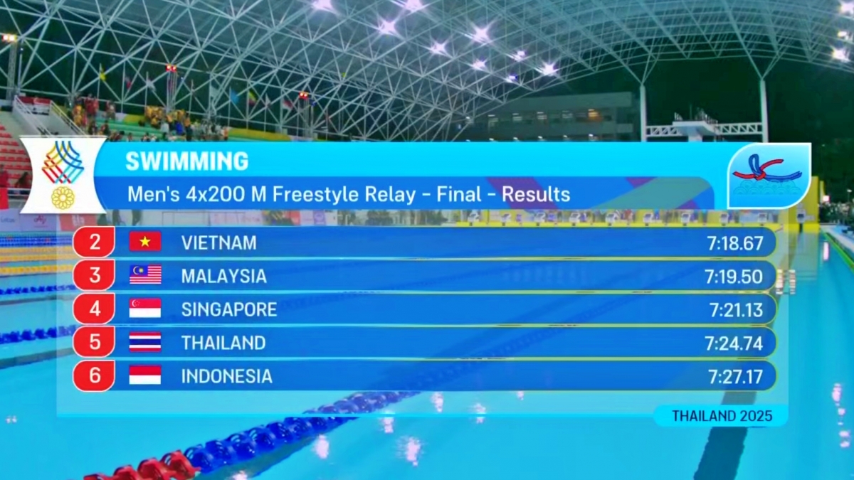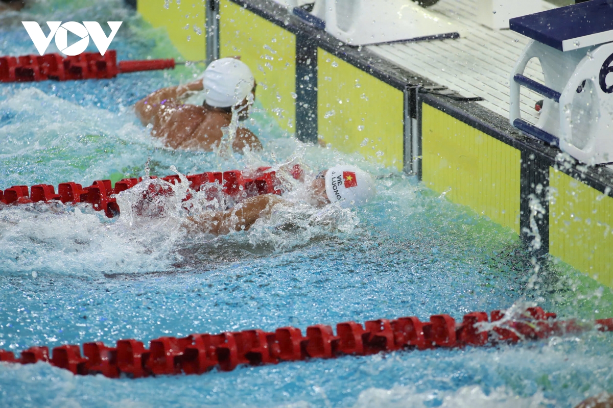 Đường đua xanh chứng kiến phong độ ấn tượng của tuyển bơi Việt Nam. Phạm Thanh Bảo mang về HCV 100m ếch nam với thành tích 1 phút 01 giây 43. Đặc biệt, đội 4x200m tiếp sức tự do nam tạo điểm nhấn lớn nhất trong buổi tối khi giành HCV với 7 phút 18 giây 67, nhờ cú bứt phá quyết định của Hưng Nguyên ở lượt bơi cuối.