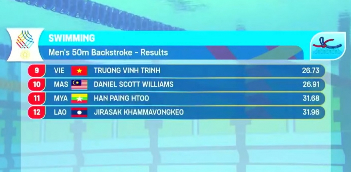 MÔN BƠI: Thành tích của Trịnh Trường Vinh ở vòng loại nội dung 50m bơi ngửa nam là 26 giây 73, đứng thứ 9/12 vận động viên tranh tài nên không được vào thi chung kết.