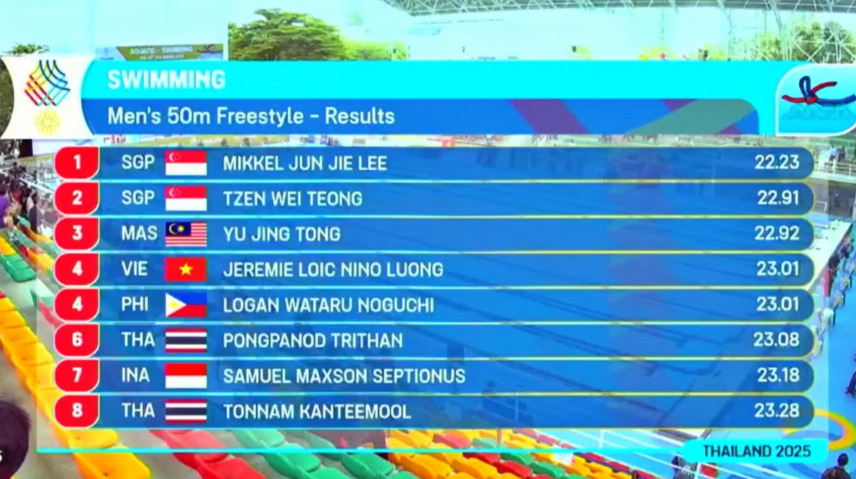 MÔN BƠI: Lương Jérémie Loic Nino không thể giành huy chương ở nội dung 50m tự do nam. Lương Jérémie Loic Nino chỉ về đích thứ 5 với thành tích 22 giây 86.
