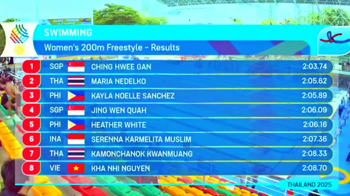MÔN BƠI: Nguyễn Khả Nhi của Việt Nam đã lọt vào thi chung kết nội dung 200m tự do nữ với thành tích 2 phút 08 giây 70. Đây là thành tích rất đáng khích lệ của kình ngư 17 tuổi.