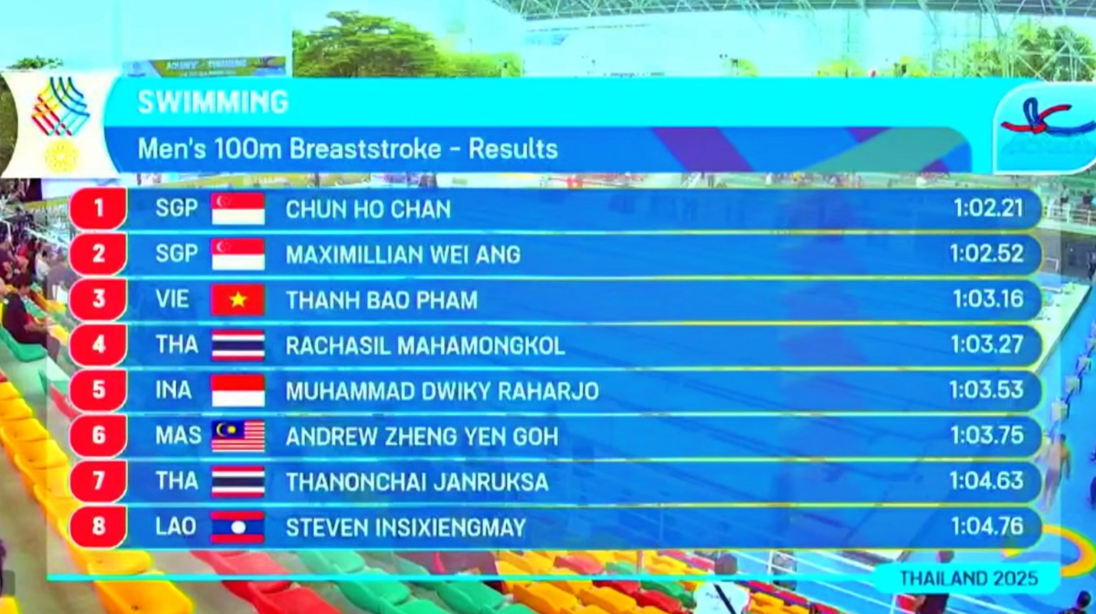 MÔN BƠI: Phạm Thanh Bảo đạt thành tích 1 phút 03 giây 16 tại vòng loại 100m bơi ếch nam. Đại diện của Việt Nam đứng thứ 3 tại vòng loại và giành quyền vào thi chung kết diễn ra vào chiều nay 11/12.