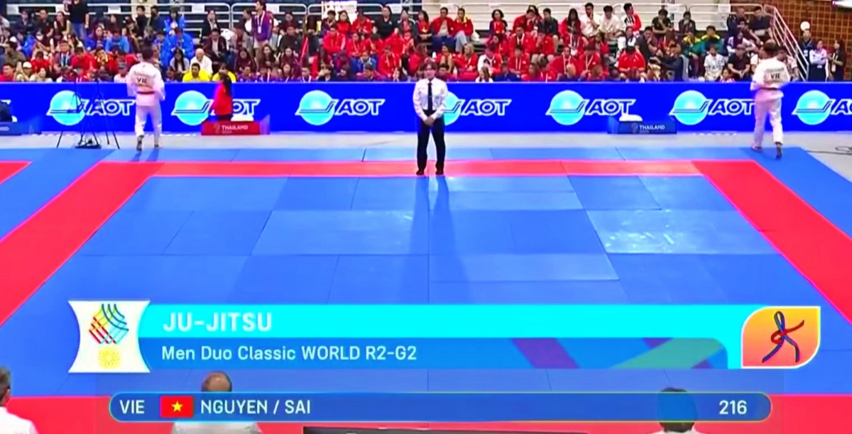 MÔN JU-JITSU: Sái Công Nguyên và Nguyễn Anh Tùng đạt số điểm 216 ở nội dung Duo Show Nam.
