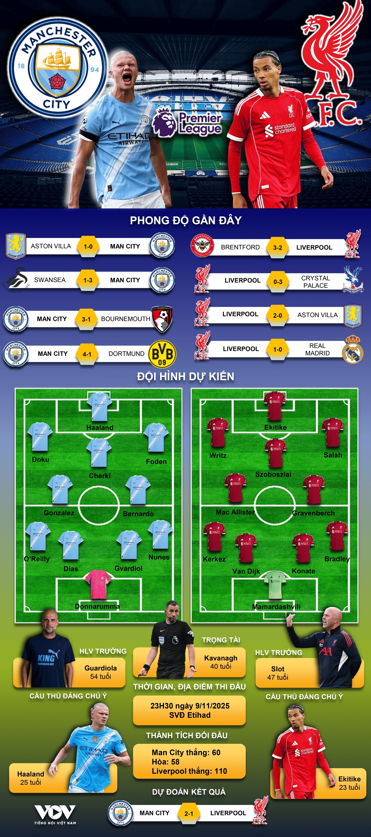 Tường thuật trực tiếp trận đấu Man City vs Liverpool trong khuôn khổ vòng 11 Ngoại hạng Anh diễn ra lúc 23h30 ngày 9/11/2025.