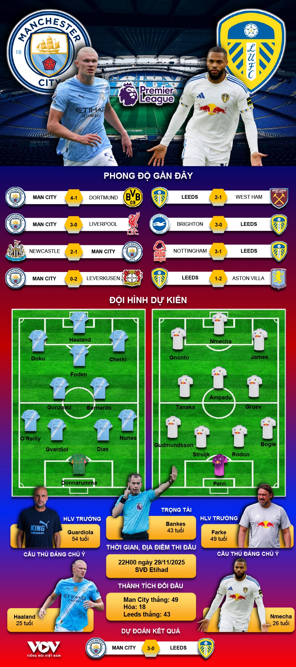 VOV.VN - Dự đoán kết quả và đội hình ra sân trận Man City vs Leeds United thuộc khuôn khổ vòng 13 Ngoại hạng Anh 2025/2026 diễn ra lúc 22h00 ngày 29/11.