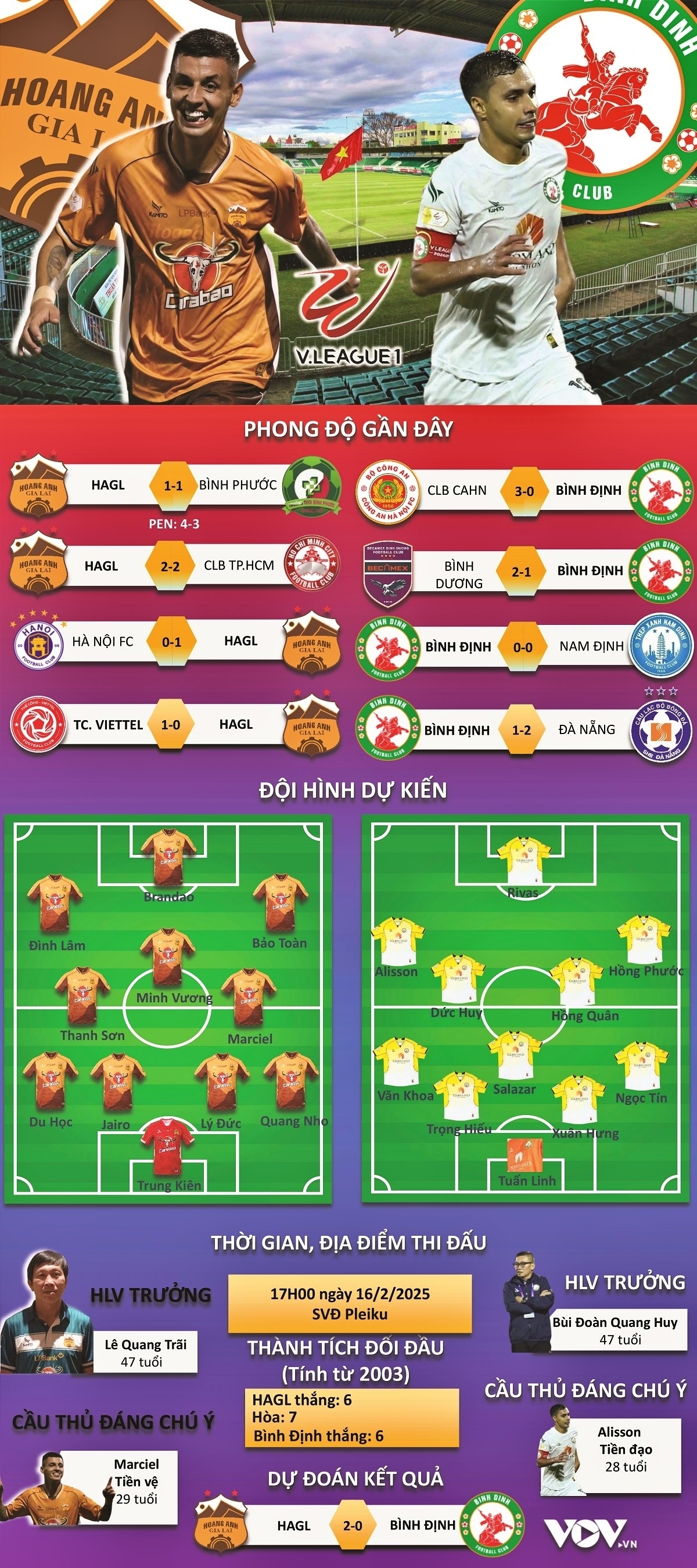 VOV.VN - Dự đoán kết quả và đội hình ra sân trận HAGL vs Bình Định, vòng 13 V-League 2024/2025 diễn ra lúc 17h ngày 16/2/2025.