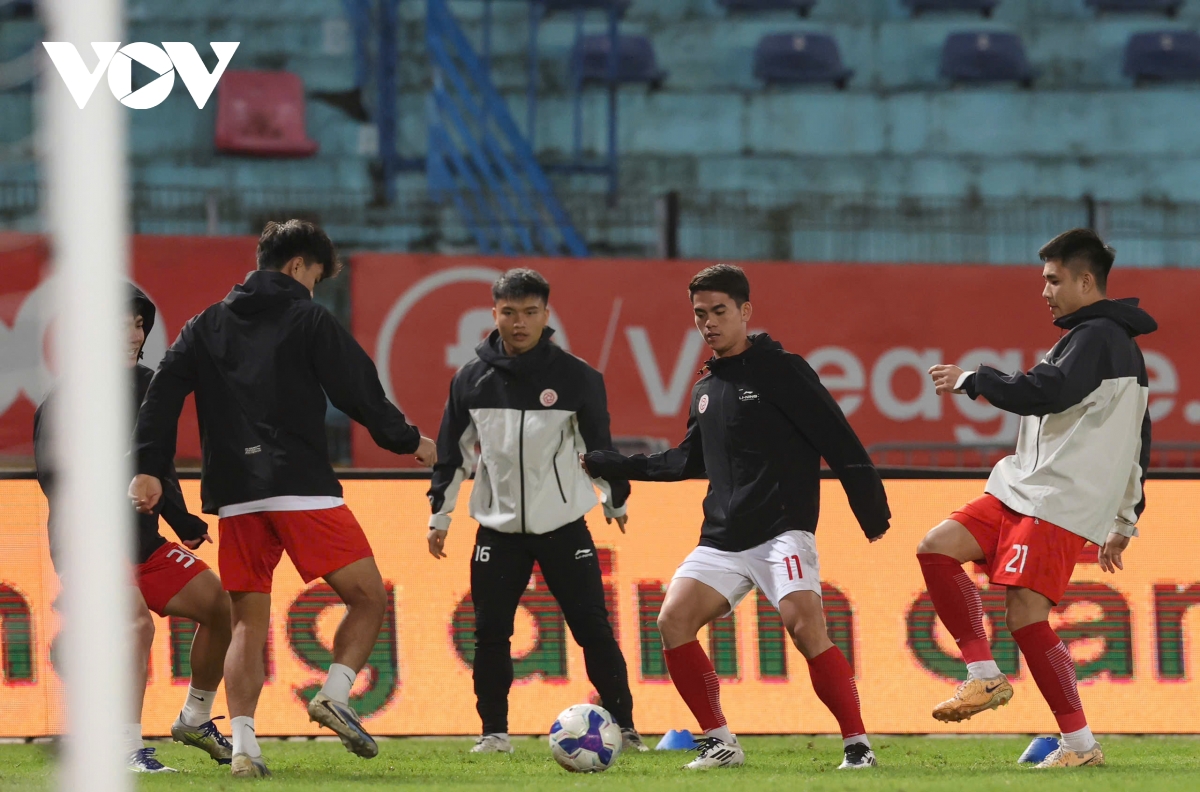 Các cầu thủ Thể Công Viettel khởi động trước trận đấu