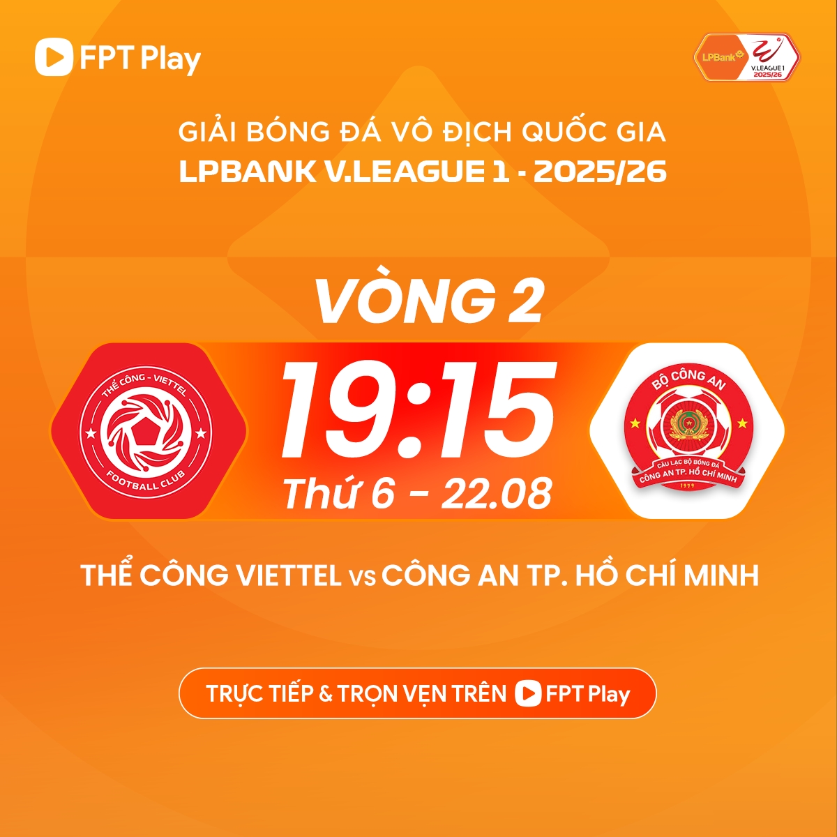 Trận đấu giữa Thể Công Viettel và Công an TPHCM trong khuôn khổ vòng 2 V-League 2025/2026 sẽ diễn ra lúc 19h15 tối nay (22/8) trên sân Hàng Đẫy. Báo Điện tử VOV sẽ tường thuật trực tuyến, mời quý độc giả quan tâm theo dõi.