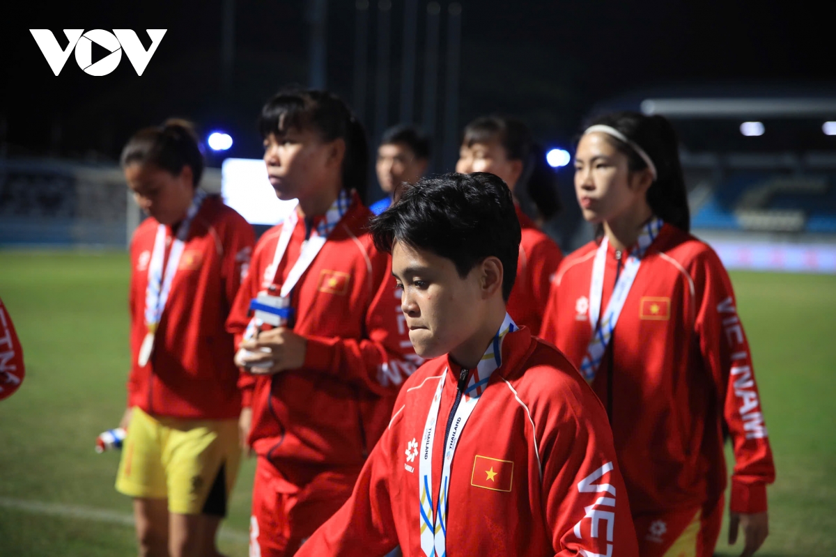 Các cầu thủ ĐT nữ Việt Nam không giấu được sự thất vọng khi bước lên bục nhận HCB bóng đá nữ SEA Games 33.