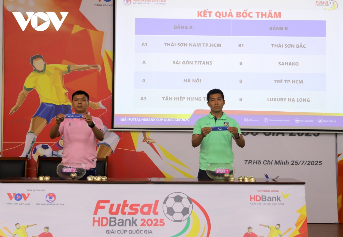 Chiều 25/7, tại TP.HCM, Đài Tiếng nói Việt Nam (VOV) và Liên đoàn Bóng đá Việt Nam (VFF) đã tổ chức Lễ công bố và bốc thăm chia bảng Giải Futsal HDBank Cúp Quốc gia 2025. Giải đấu sẽ diễn ra từ ngày 3/8 đến 12/8 tại Nhà thi đấu Lãnh Binh Thăng.