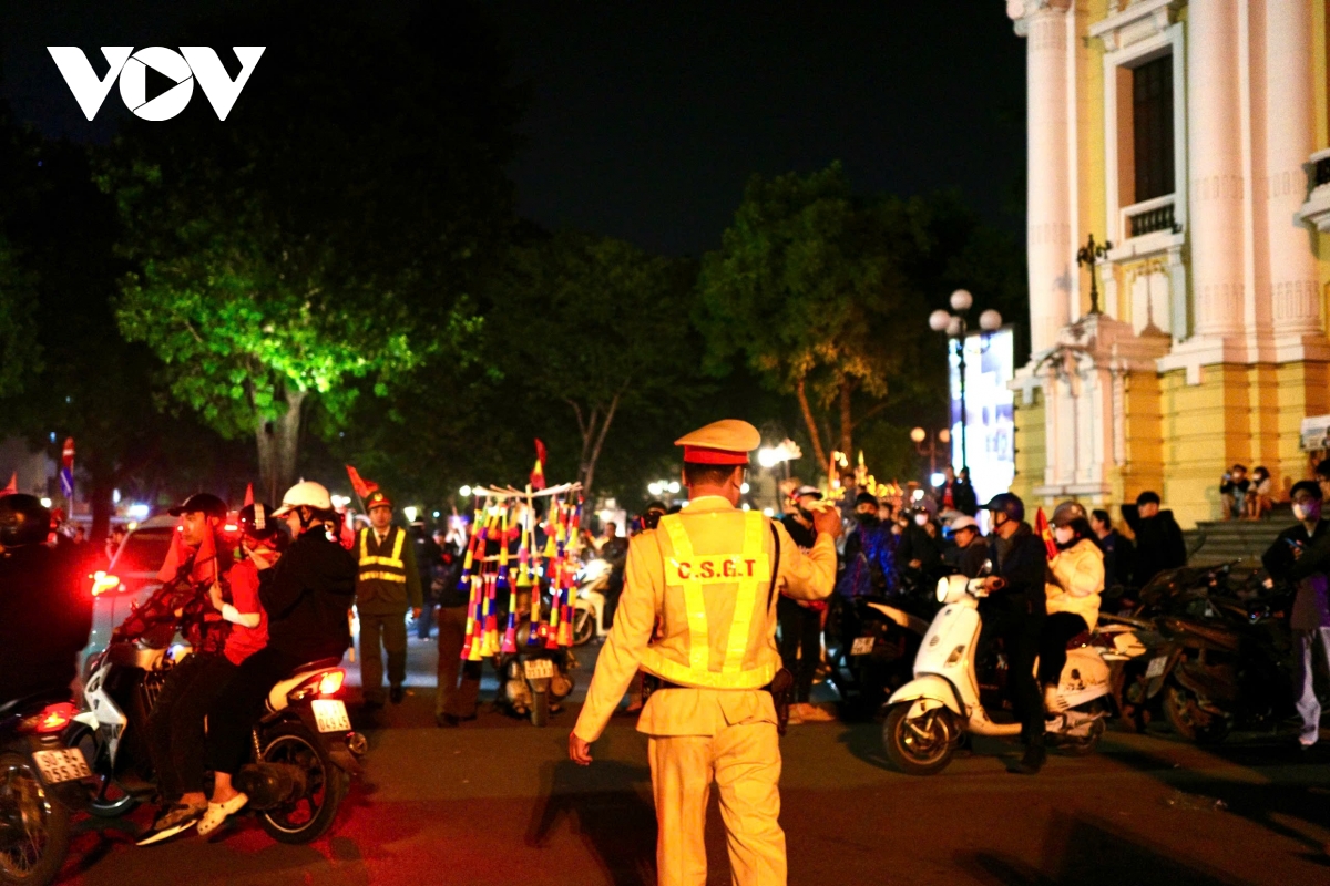 Lực lượng cảnh sát giao thông, cảnh sát trật tự được bố trí dày tại khu vực Nhà hát Lớn, phân luồng từ sớm, liên tục nhắc nhở người dân đi chậm, không dừng đỗ lâu, góp phần giữ trật tự, an toàn trong không khí ăn mừng sôi động.