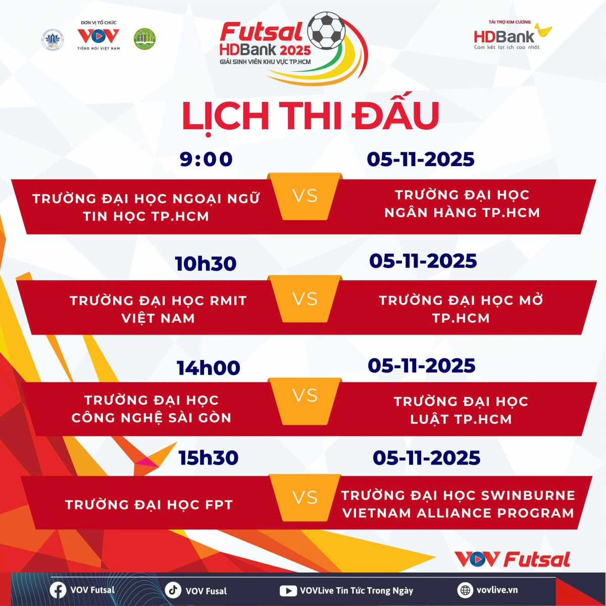 Lịch thi đấu giải Futsal HDBank Sinh viên khu vực TP.HCM năm 2025 hôm nay 5/11. Sẽ có 4 trận đấu diễn ra trải dài từ buổi sáng đến buổi chiều. Giải do Đài Tiếng nói Việt Nam phối hợp cùng Hội thể thao Đại học và Chuyên nghiệp TP.HCM, Trường Đại học Nông lâm TP.HCM tổ chức với sự đồng hành của Ngân hàng HDBank. Đây là năm thứ 3, giải Futsal Sinh viên được tổ chức theo khu vực hướng tới mục tiêu tạo sân chơi Futsal toàn quốc cho sinh viên, giới trẻ, và quảng bá bộ môn này.