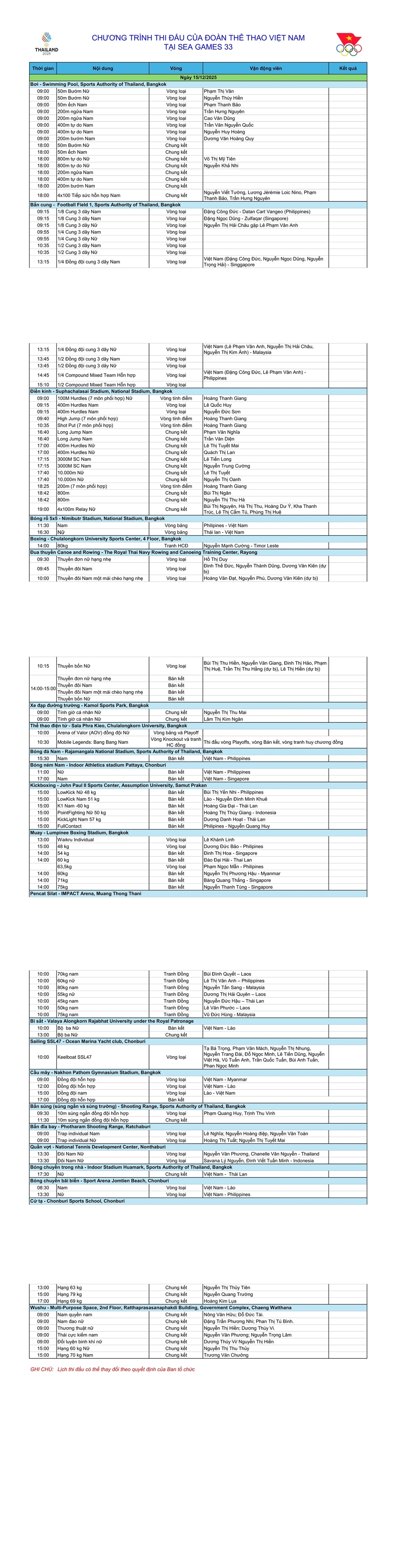 Lịch thi đấu SEA Games 33 của Đoàn Thể thao Việt Nam hôm nay 15/12, các VĐV nước nhà sẽ tiếp tục tranh tài ở rất nhiều môn, trong đó tâm điểm sẽ là bóng đá nam và bóng chuyền nữ.