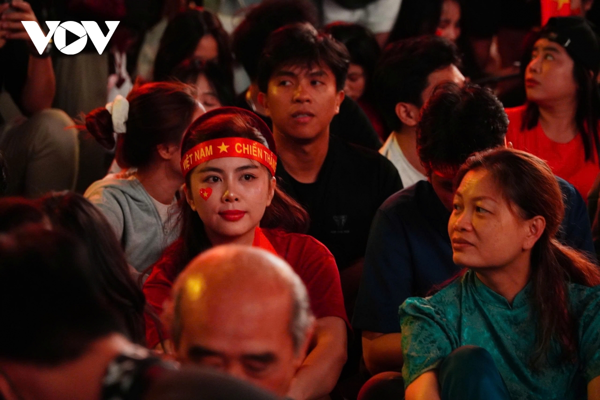 Càng về tối, không khí cổ vũ càng thêm náo nhiệt. Nhiều người khoác áo cờ đỏ sao vàng, mang theo băng rôn, cờ Tổ quốc, sẵn sàng hò reo khi các cầu thủ xuất hiện trên màn hình. Xung quanh khu vực phố đi bộ, các xe bán kèn, băng đô, cờ cổ động hoạt động liên tục, phục vụ nhu cầu của người hâm mộ.