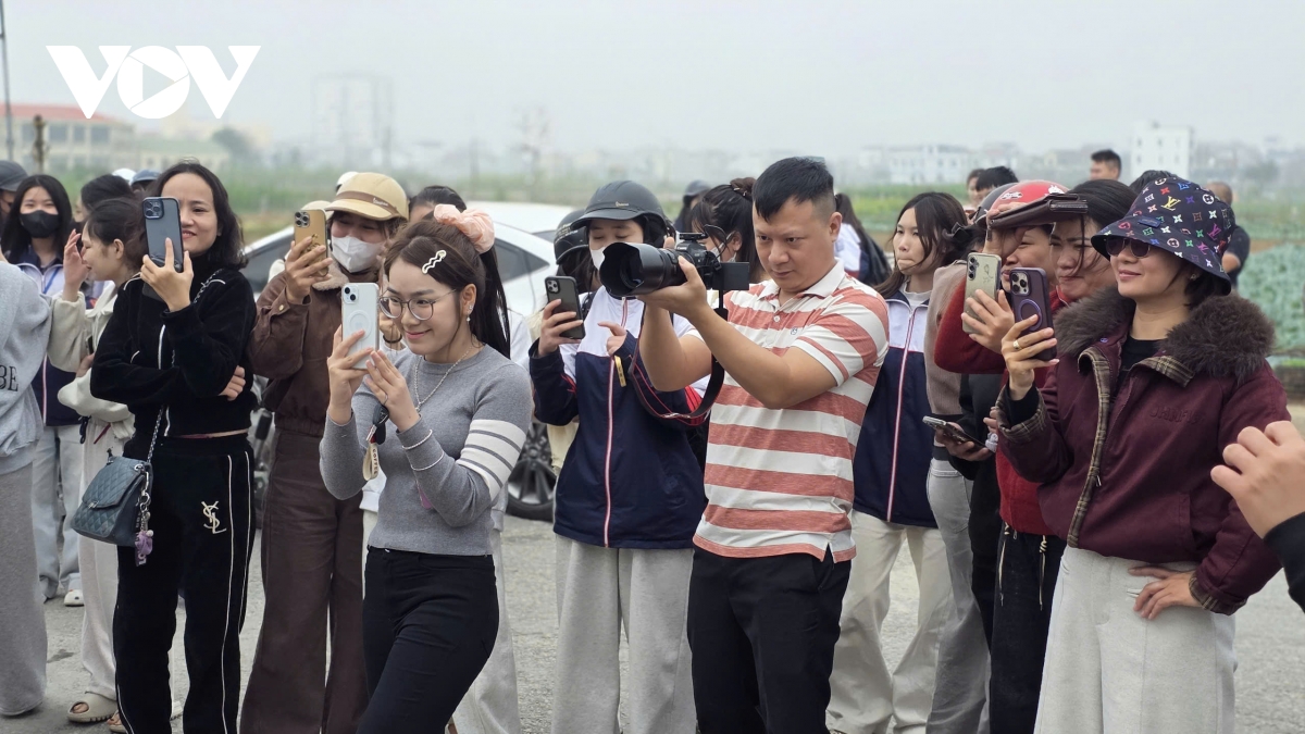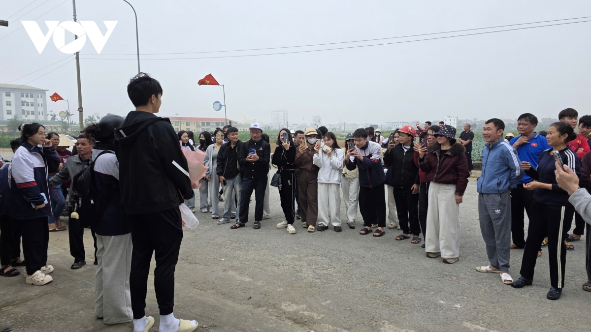 Đông đảo người dân đã nồng nhiệt chào đón và chụp ảnh lưu giữ những khoảnh khắc khi thủ thành Cao Văn Bình đặt chân về đến quê nhà. (Ảnh: Bá Thăng).