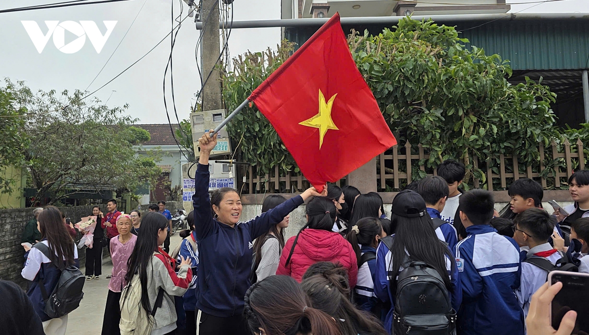 Người dân vui mừng cầm cờ Tổ quốc vẫy, chào đón sự trở về của thủ thành Cao Văn Bình. (Ảnh: Bá Thăng).