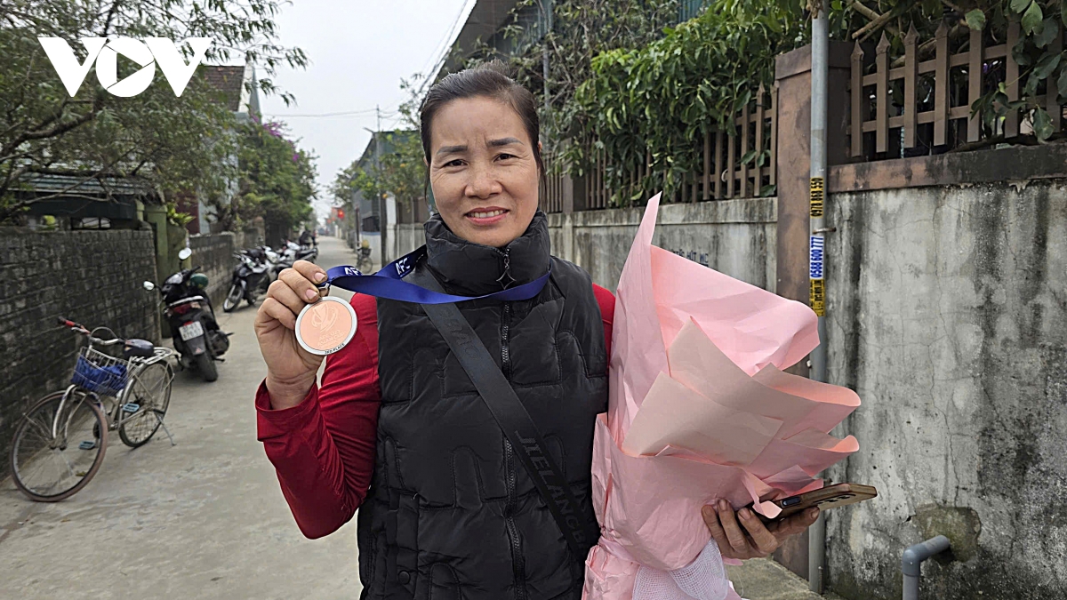 Chị Nguyễn Thị Hường, mẹ thủ thành Cao Văn Bình cùng tấm huy chương đồng của U23 Việt Nam. (Ảnh: Bá Thăng).
