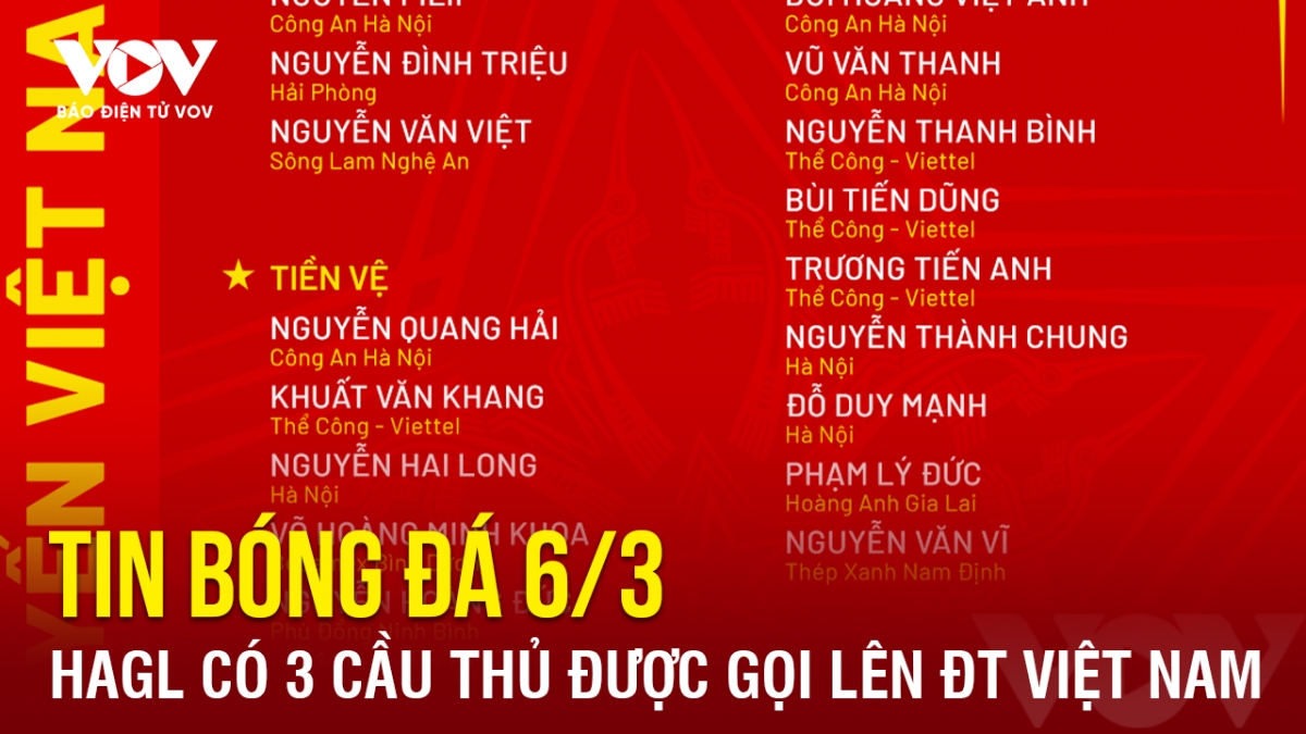 VOV.VN - Tin bóng đá hôm nay 6/3 có những nội dung đáng chú ý sau đây: HAGL có 3 cầu thủ được gọi lên ĐT Việt Nam; CLB Hà Tĩnh nhận lợi thế lớn trước vòng 16 V-League; ĐT nữ Việt Nam bỏ xa Thái Lan, tiếp tục dẫn đầu Đông Nam Á trên BXH FIFA.