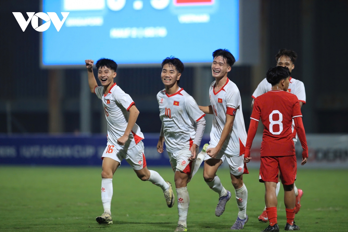 U17 Việt Nam có màn trình diễn thuyết phục khi đánh bại U17 Singapore với tỷ số 6-0 ở lượt trận diễn ra tối 22/11 tại vòng loại U17 châu Á 2026. Đội chủ nhà nhập cuộc chủ động, dồn ép ngay từ những phút đầu và sớm tạo ra bước ngoặt khi được hưởng phạt đền ở phút thứ 3. Trên chấm 11m, Đại Nhân dứt điểm chuẩn xác mở tỷ số 1-0.